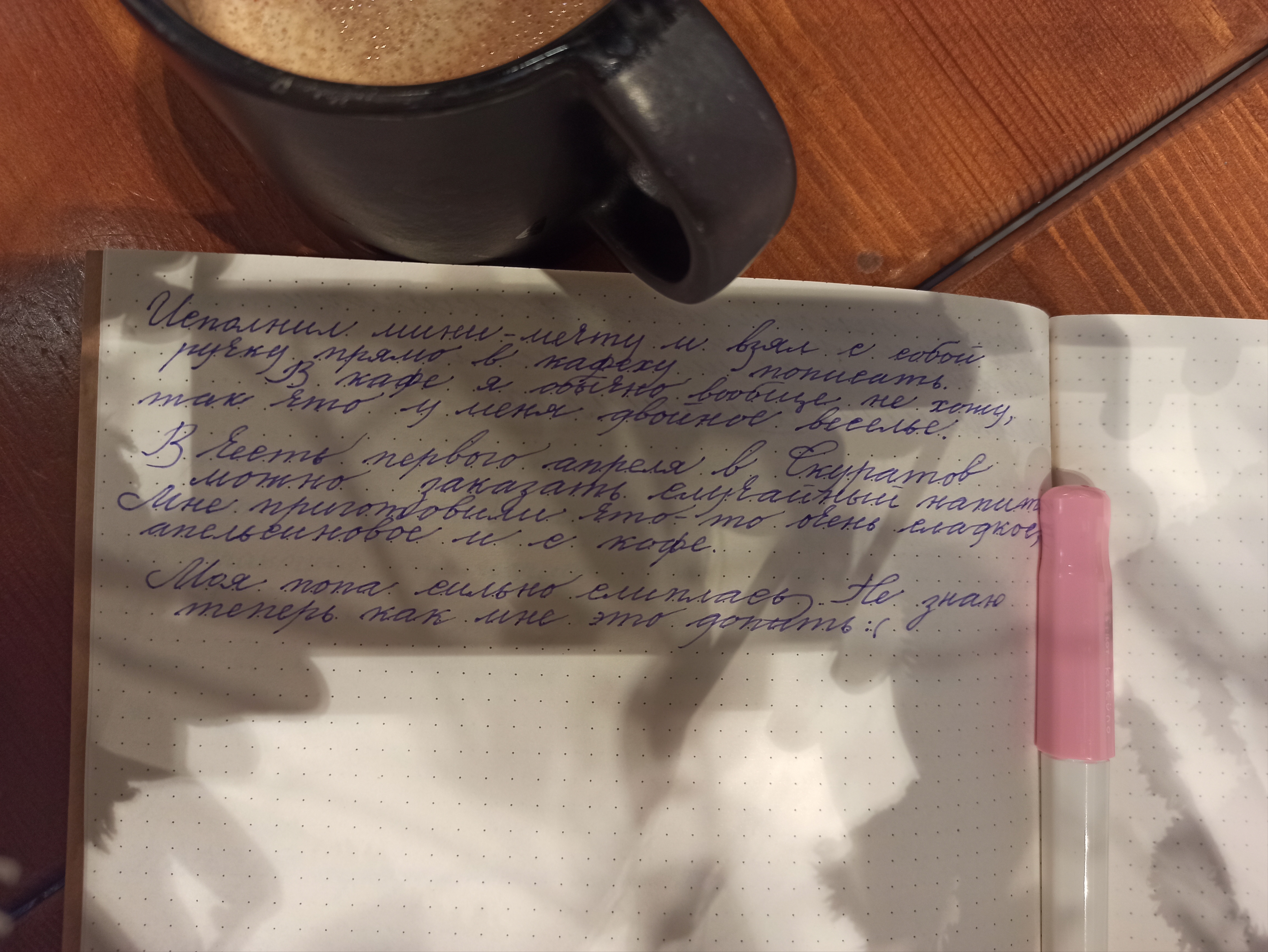 Я решил купить себе черную ручку и подумываю о том, чтобы вернуться к детскому занятию в виде ведения дневника, раз уж мне так доставляет писать от руки, а писать нечего. Буду иметь в рюкзаке синюю ручку на всякий случай. В будущем куплю перо.