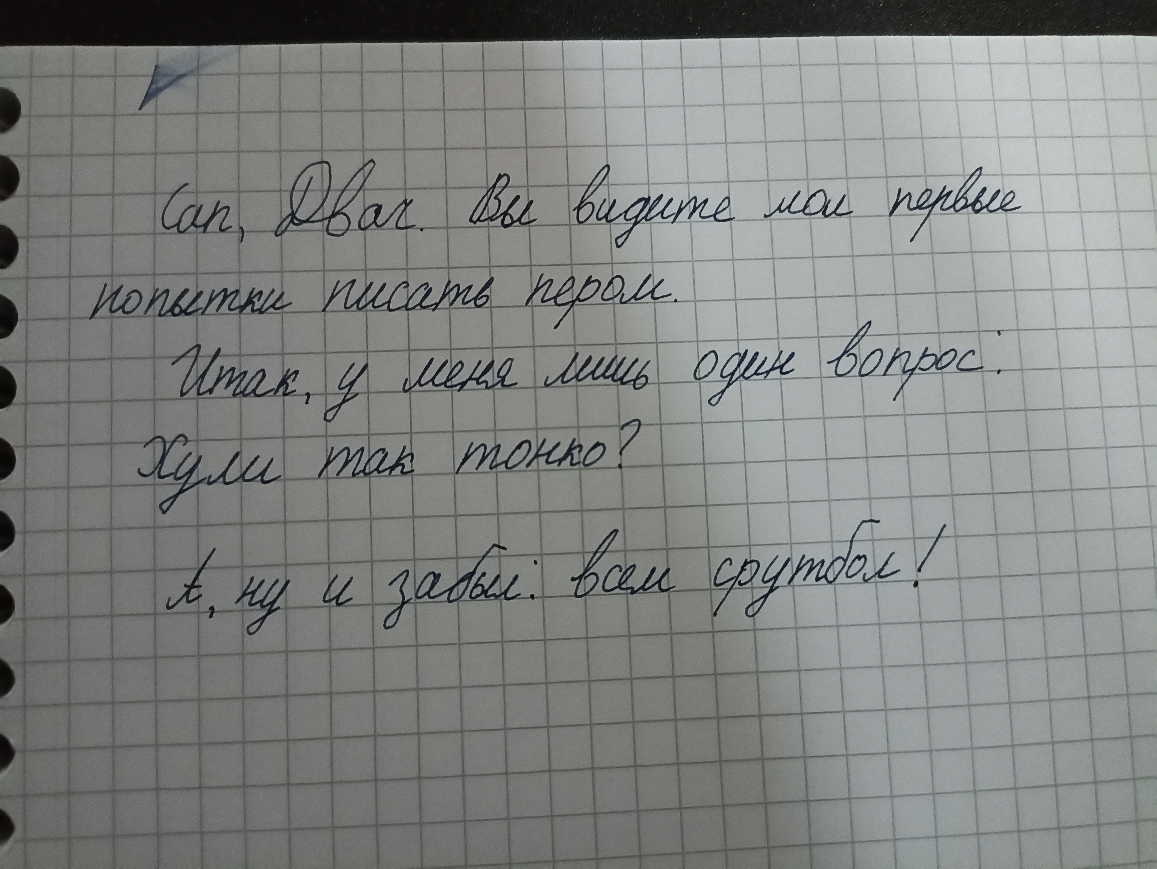 Сука, вы заебали смеяться над СРУТБОЛОМ. Ясно же видно, что это Ф, ну ебаные в рот, я вообще-то потел, чтобы свой почерк на уровень СРУТБОЛА вывести, суки гниды!!!