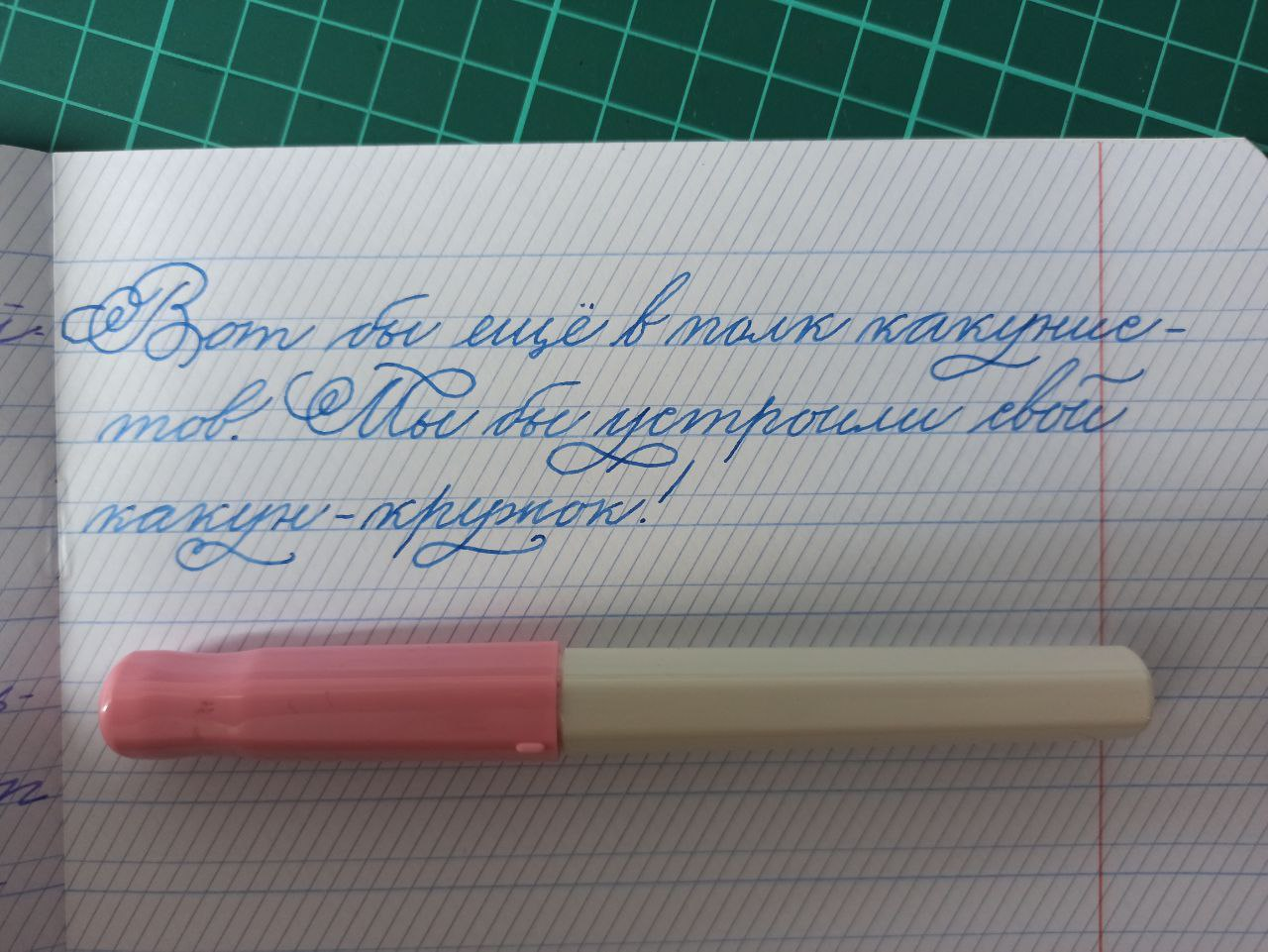 Кстати, срутбол-какун, можешь ещё попробовать вот ето: https://www.youtube.com/watch?v=tsreFr75mX8 , может, твою ручку надо просто вылечить от фимоза. Только заранее посмотри на свет, есть ли там просвет меж усов. Перо для этого должно быть без чернил!