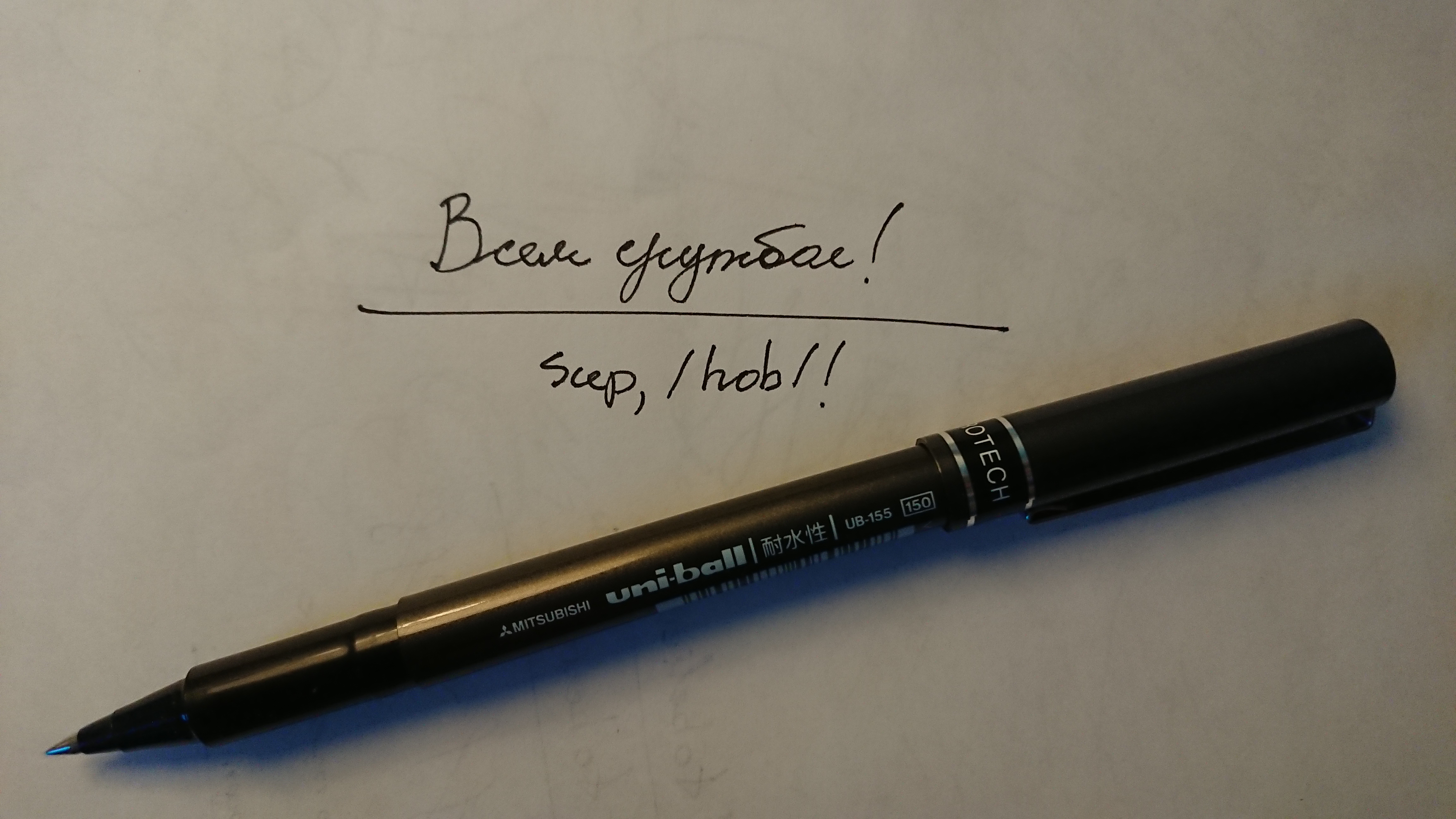 А на моего знакомого студента таки стали обращать внимание из-за перьевой ручки. Препод назвала его "приколистом", остальные смотрят как на чудика. А я со своим роллером никому нахуй не упал, да и слава богу. Недавно с Китая заказал V5 и V7 (потолще линия, 0.7мм) с картриджной системой. Думал с черными чернилами взять, но можно попасть в неудобную ситуацию, когда внезапно нужно будет подписать документ именно синей ручкой, а ее не будет под рукой.