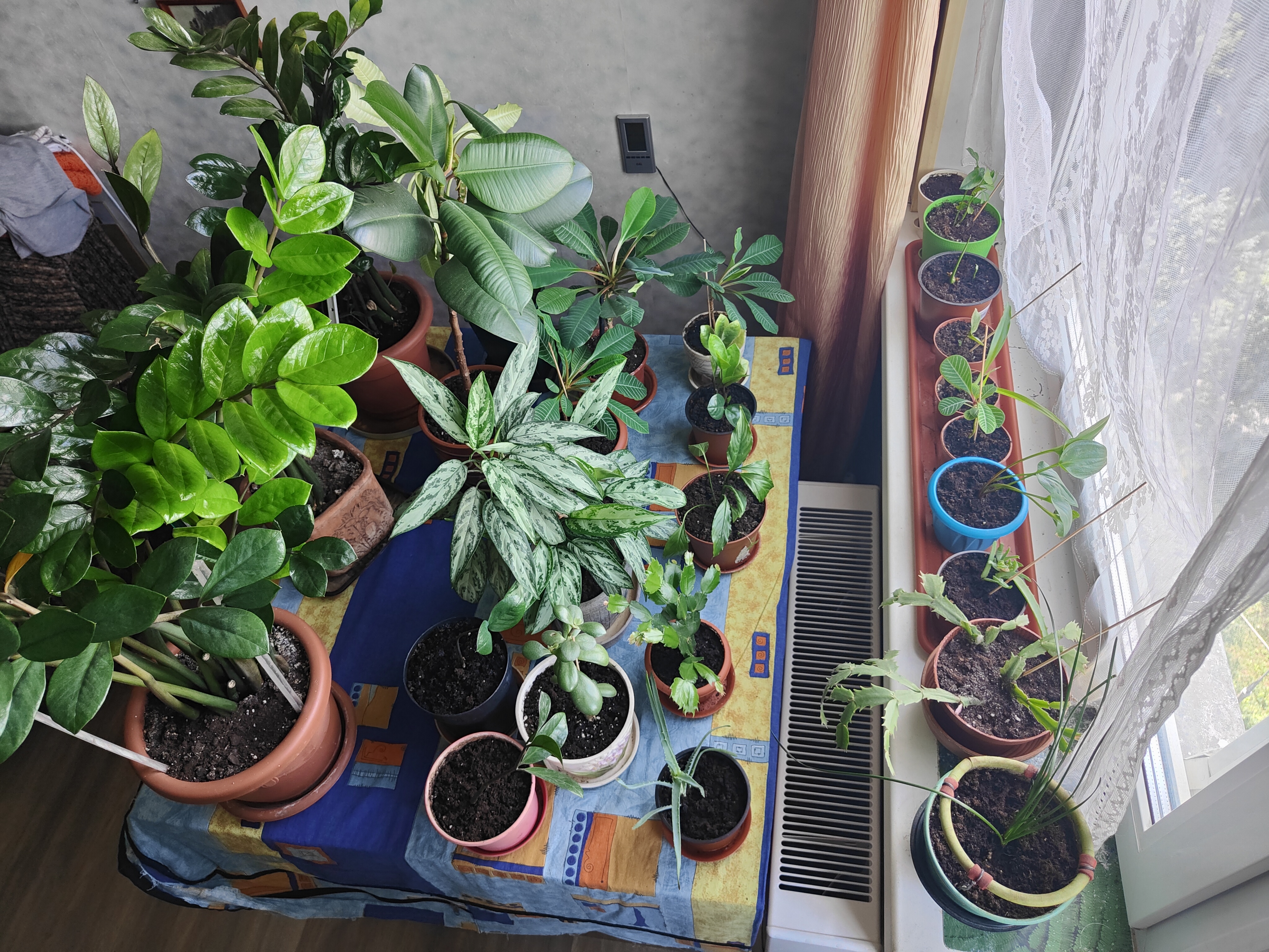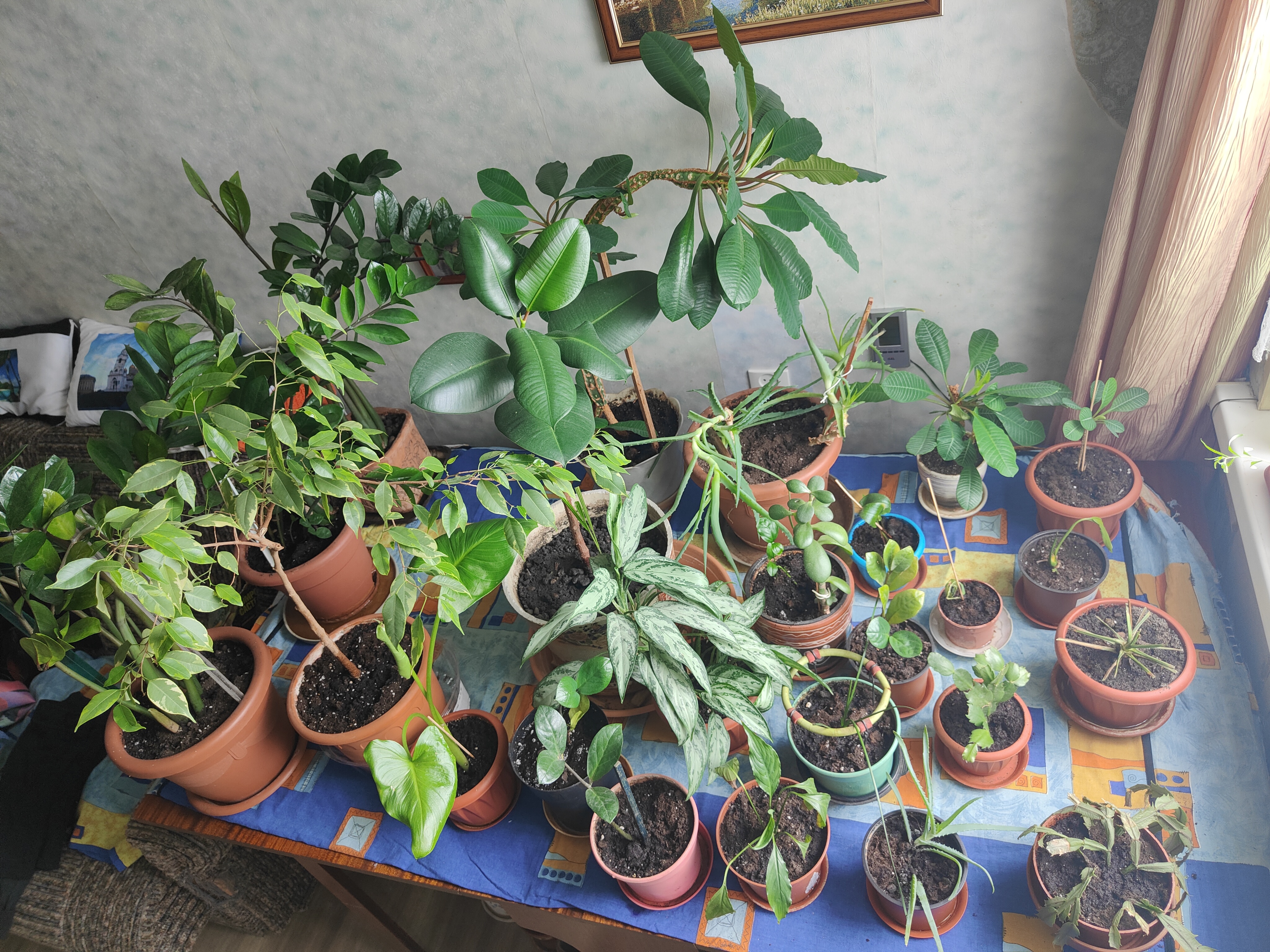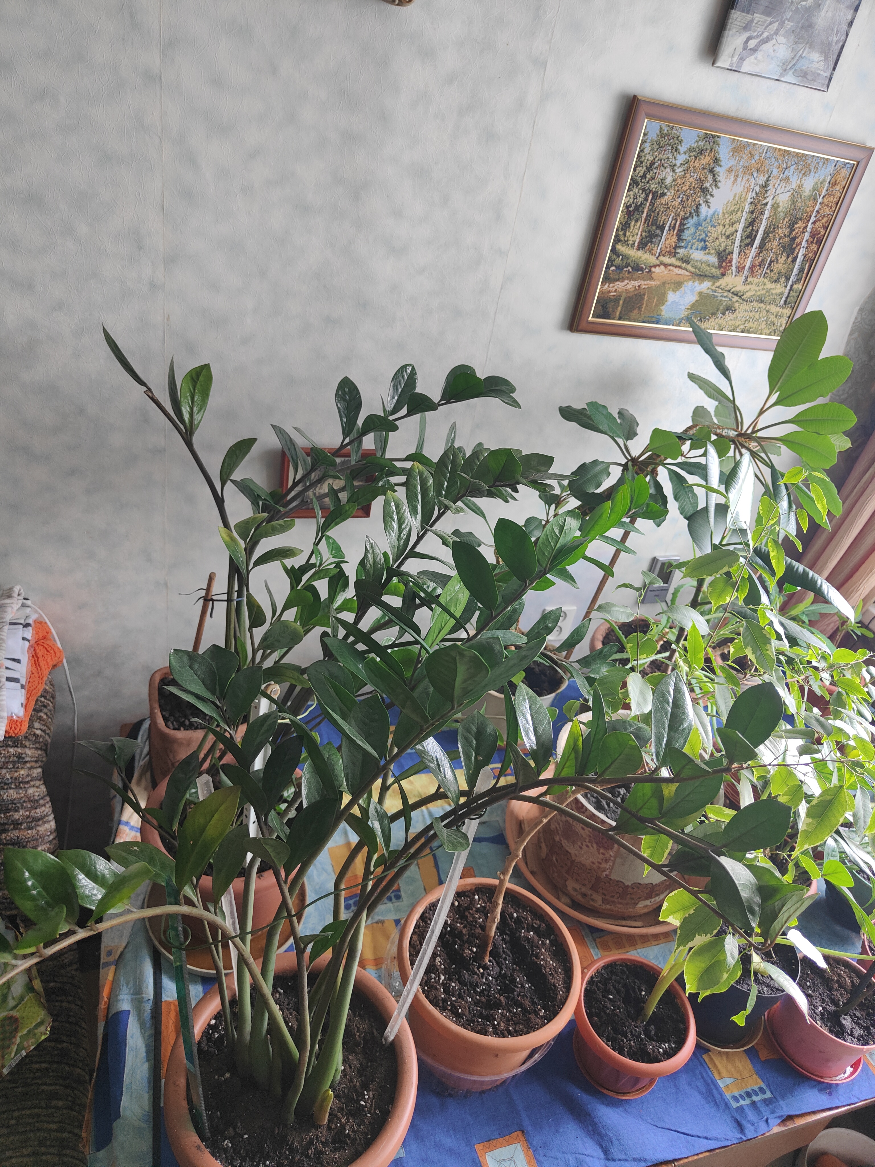 >>768475 В общем она ещё больше стала. >>769396 Лиана ебанула наконец-то в рост. Может получится поставить над пекой и через лески пустить к окну. Будет эдакий шалаш в комнате кек. >>770854 Ну и стол разобрал по итогу. Пересадил всё, кроме здоровяков, потому что их лень. Видно хуево, но у всех мелких замиокулькасов или как их там появились мелкие отростки. У одного здоровяка распустились вот так штуки, а у другого сейчас должно.