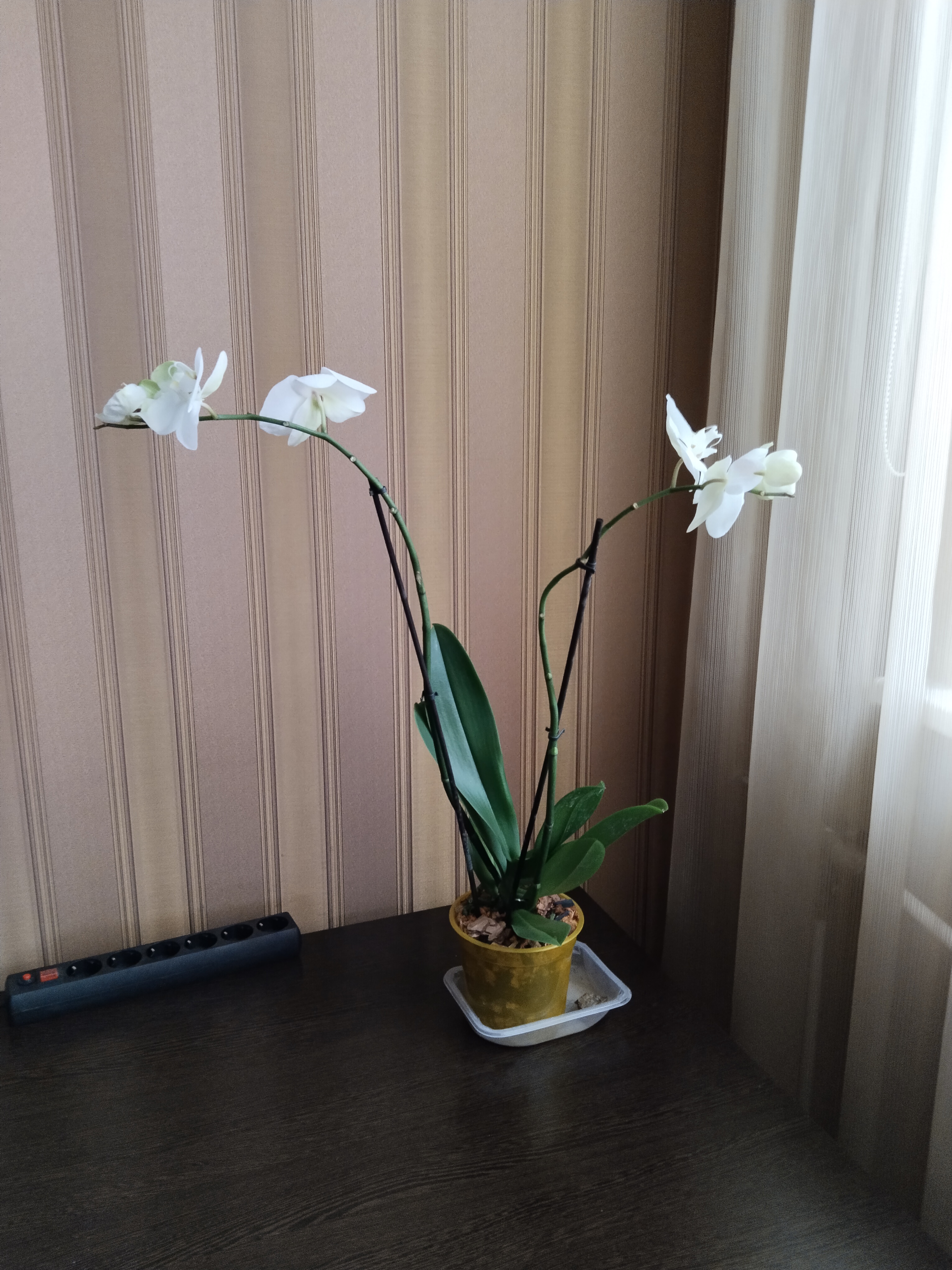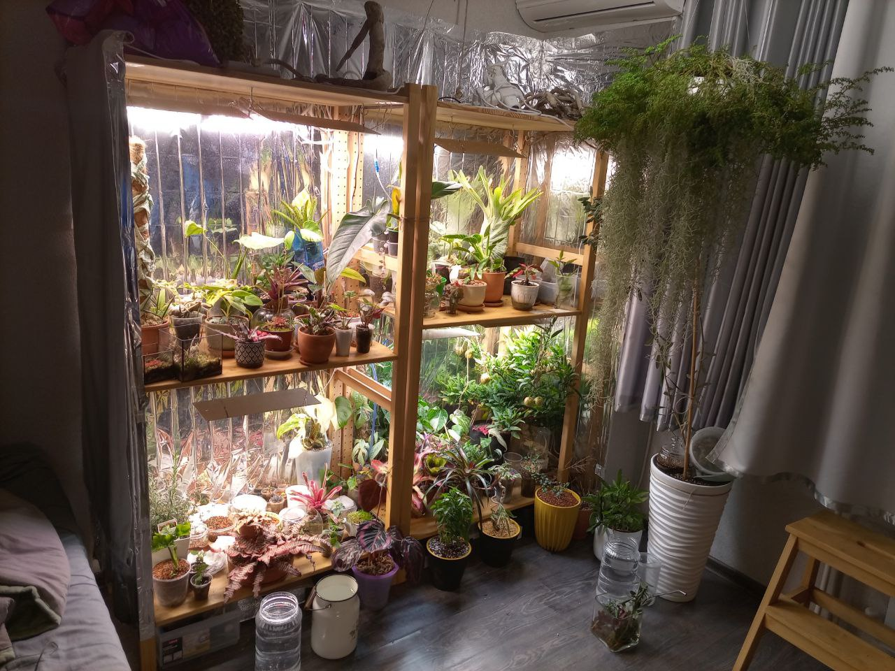 На данный момент орхидеи (7 + мини реанимаха) живут в импровизированном гроубоксе (хотя скорее гроутубус) из пенофола 5мм со светоотражающим полом и потолком. В качестве освещения используется две настольных лампы: линейная с панелью примерно в 20см 6500к (9w/400lm на коробке, по номиналам блока питания- 7 ватт) и точечная 4000к на 8 диодов (4 ватта по номиналам бп), 14-16 часов света. Согласно замерам с помощью смартфона свет составляет в среднем 4,5к люкс на уровне листьев. В боксе влажность стабильно 50% на пассивных испарителях (периодически повышаю до 70% пульвиком), температура 24-26 (грею за счёт двух китайских термосов, которые нихуя не термосы, но оказались хорошими грелками. Вместо крышек сделал алюминиевые колпаки с маленьким отверстием сверху по центру - тем самым создавая общую влажность до 80-82%), без них- примерно 21 днём и 18-19 ночью. 4 растихи имеют цветоносы или цветут (дали ещё до бокса), остальные раскрыли корни и/или дали их новый рост / растят листики.