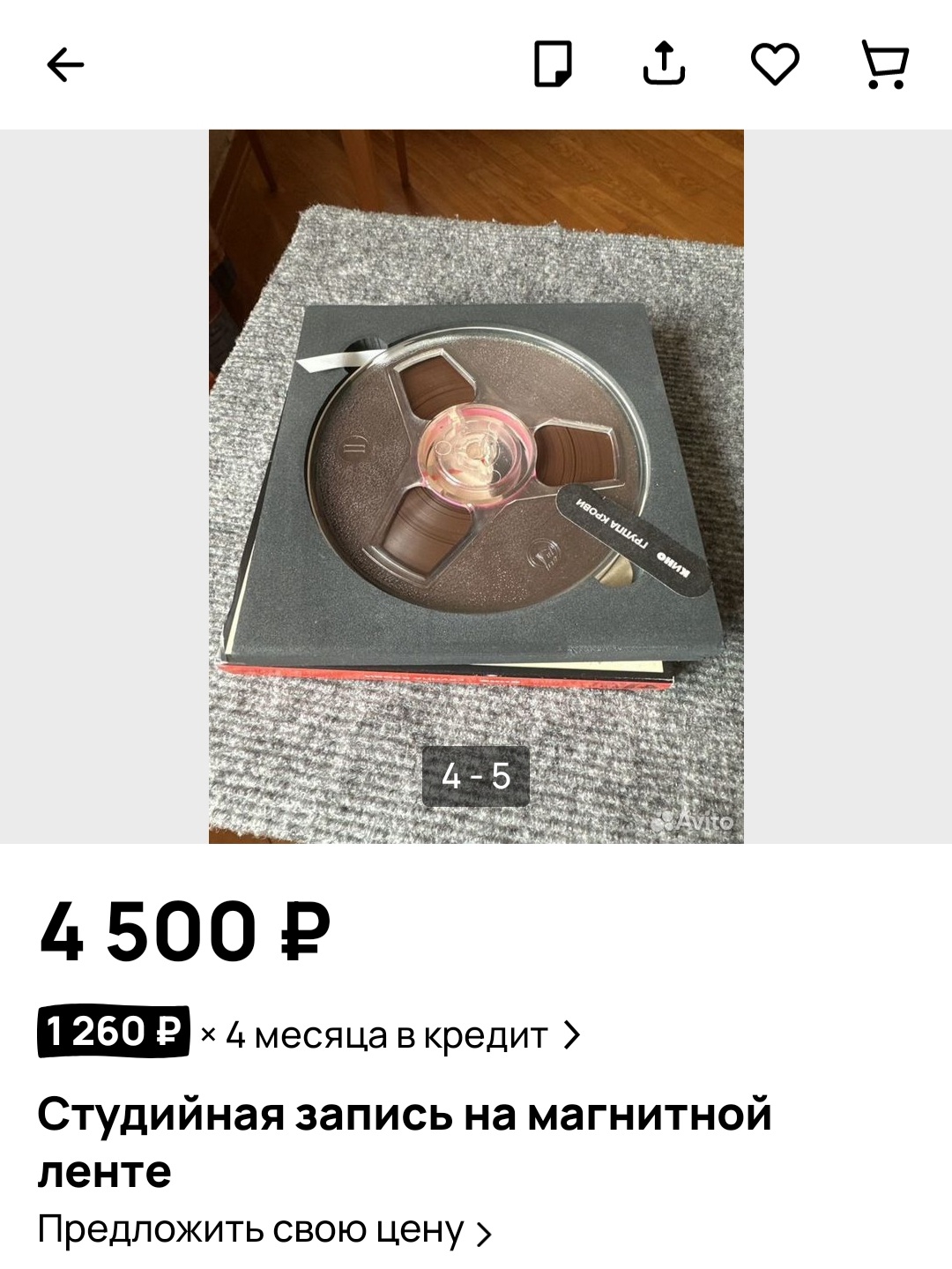 Пикрил. Катушка советская, Свема. Они хотя бы использовали новую ленту, или это куплено на Авито с помоек? Судя по поцарапанному центральному отверстию, катушка б/у, просто сохранилась приемлемо. Ахаха, берут заезженные ленты на Авито, пишут музыку и продают. Машина Records - и ведь не дед с магнитофоном! "Студийная запись", ну-ну. Что-то сомневаюсь я, что там стоит студийная аппаратура для тиражирования музыки на магнитной ленте, скорее всего, там просто магнитофон, японский или советский "высшей группы сложности", а то и вообще "Союз МК-110С" какой-нибудь.