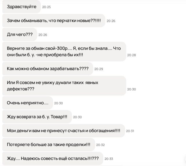 >>770771 Она тебе и так негатив влепит. Не давай ей ничего. Если фото перчаток новых осталось, то просто в ответе напишешь, что перчатки были совершенно новые. В спокойной манере только пиши, без хамства. Так будет видно, что ты адекват. Кроме того у тебя сохранится эта ебанутая переписка, котору сможешь скинуть другим покупам у которых будут сомнения брать у тебя или нет.