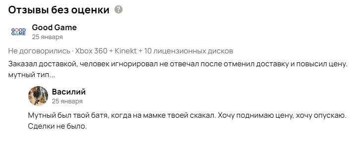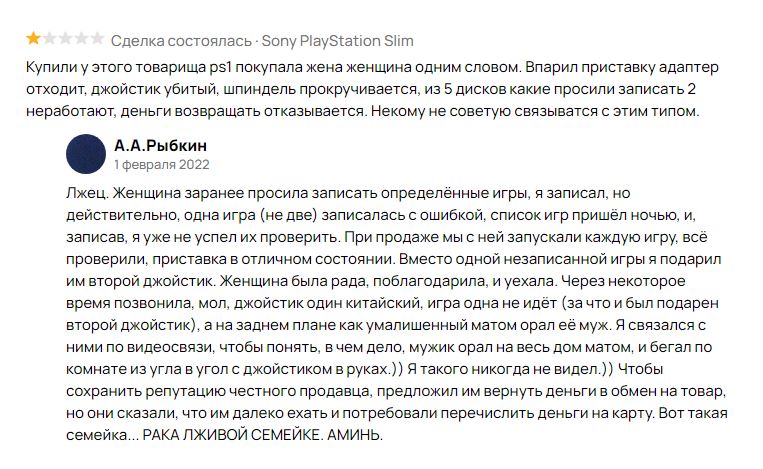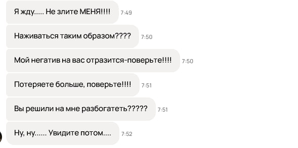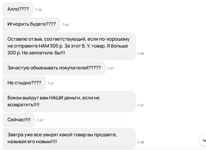 После получения товара начала срать мне по 30 сообщений в секунду, что мол товар б/у (хотя это нихуя не так и аргументировать свою позицию она не может толком) и что я обязан ей выплатить компенсацию в 300 рублей за ложь и обман. Грозится написать хуевый отзыв. Все бы ничего, но профиль этот у меня относительно новый, чистый, без отзывов, и ее одна звезда может весьма негативно отразиться на продажах.