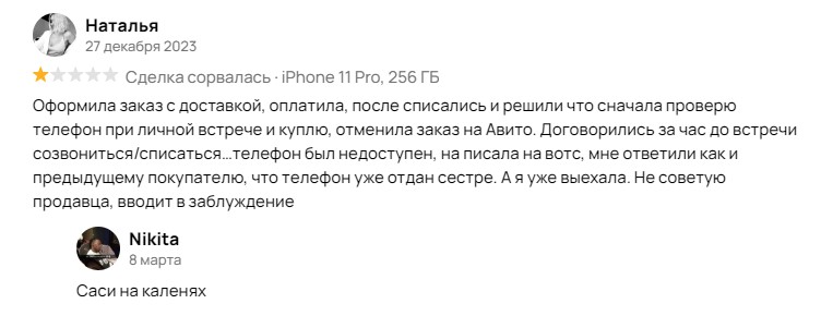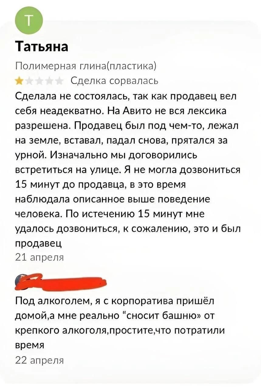 В: Что делать, если покупан не пришел на встречу/не выходит на связь/игнорит? О: Это база. Привыкай и терпи, если нет мочи терпеть - можно накатать гневный отзыв, но их все ровно никто не читает, а авито может отклонить по своей прихоти, магазины вообще сами модерируют свои отзывы, ибо кто оплачивает, тот и танцует продаёт.