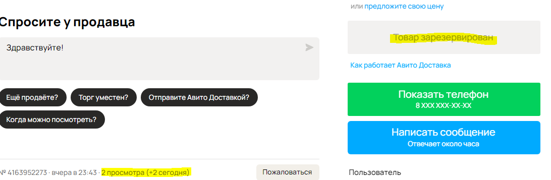 >>772658 >>772661 Зарезервировать можно и без авито-доставки сейчас. Там у продавана есть кнопка специальная для этого. Так что на всякий случай писать есть смысл.