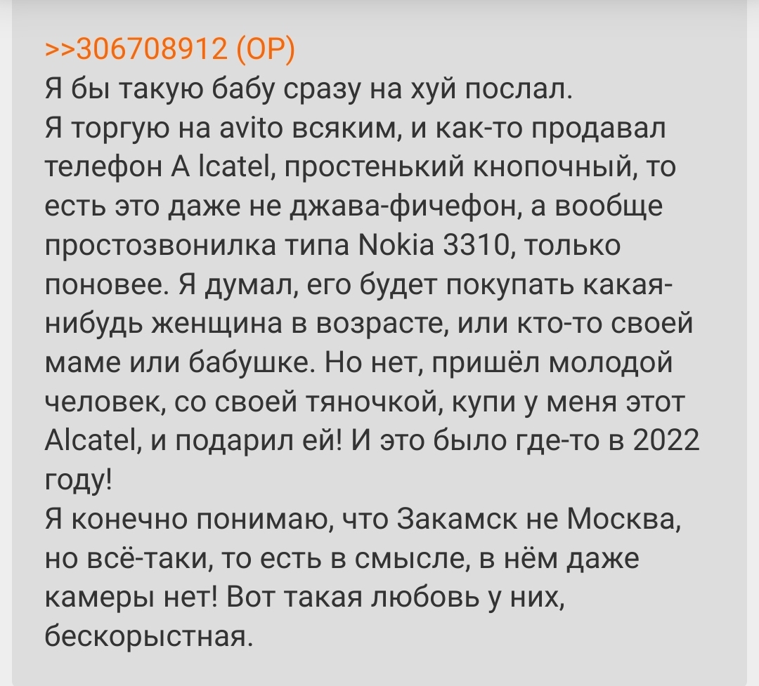 >>770771 >Некая дама приобрела у меня перчатки за 600 нищих рубликов, предварительно слёзно выпросив скидку в 200 деревянных (говорила, мол, что у нее ребенок инвалид, воспитывает одна, стандартная хуйня). Сразу таких сливаю, если общение начинается сразу с проблем то ничего хорошего не жди. Недавно тут рылся в помойке в поисках новых товаров для авиты и тут до меня доебалась бабка что я там лут разложил. Ну стандартный бабкины тейки про щасмылицыювызову была послана нахуй. Ебаные вахтеры которые решили что кому-то не поебать на ваше блядское мнение вопросы и хотелки ахахах блят.