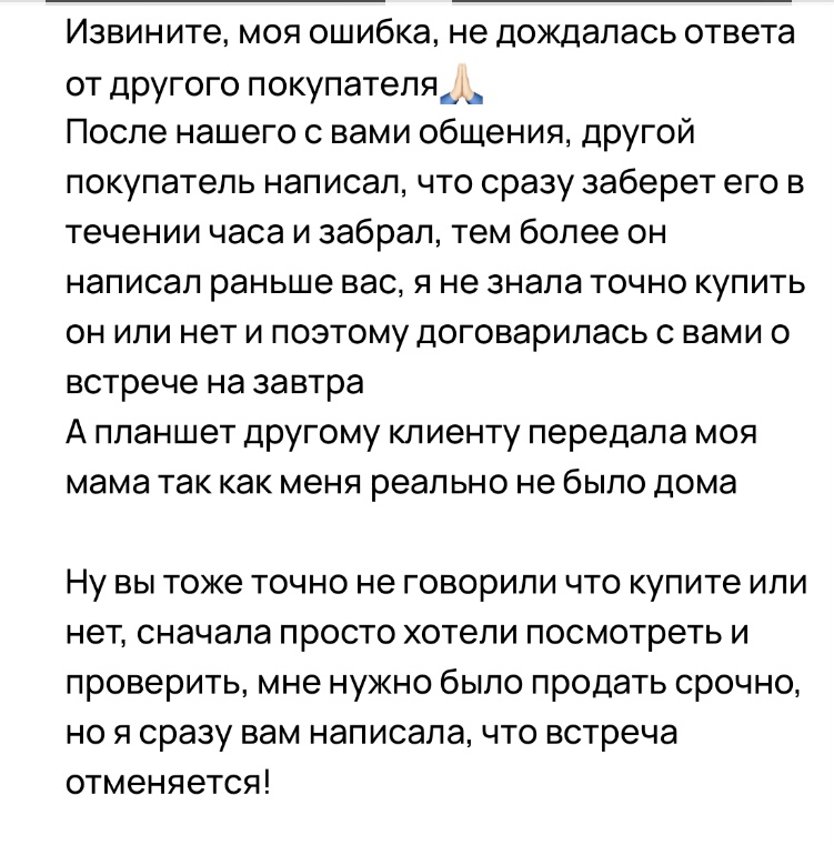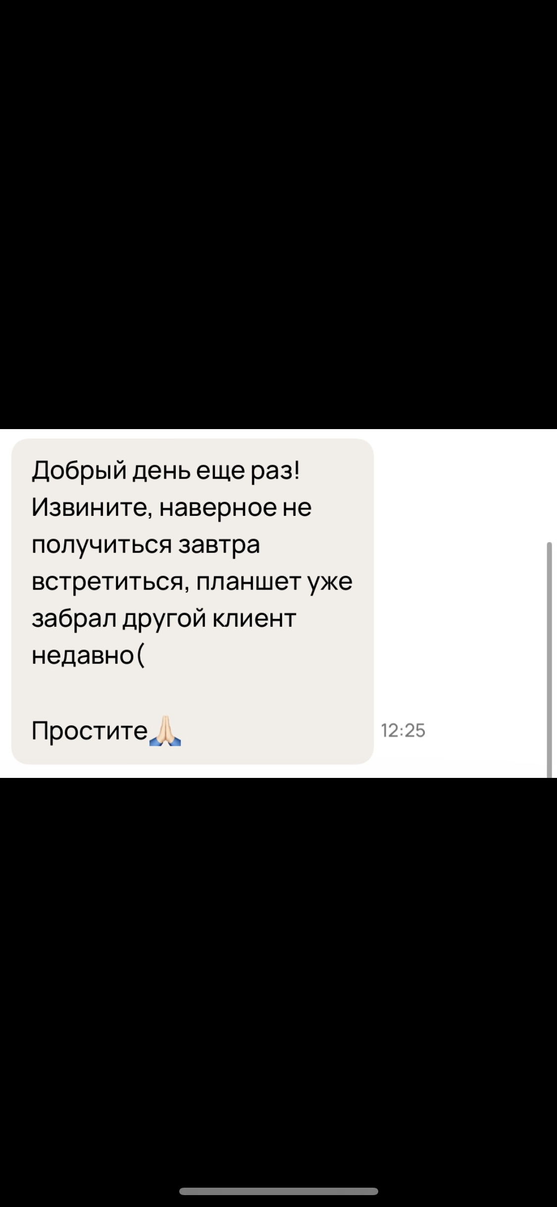 ситуация немного разъяснилась. мой обсер в том, что я не добавил волшебную фразу вроде "если всё как вы и описали, то точно заберу", и она подумала, что я планшет могу и не купить. но какого фига она согласилась с другим "в течение часа", если мне сказала "только завтра" объявления вроде бы нет уже, это был ipad 6 2018 с клавой, стилусом и чехлом в отличном состоянии за 10к, когда средняя цена на похожие около 20