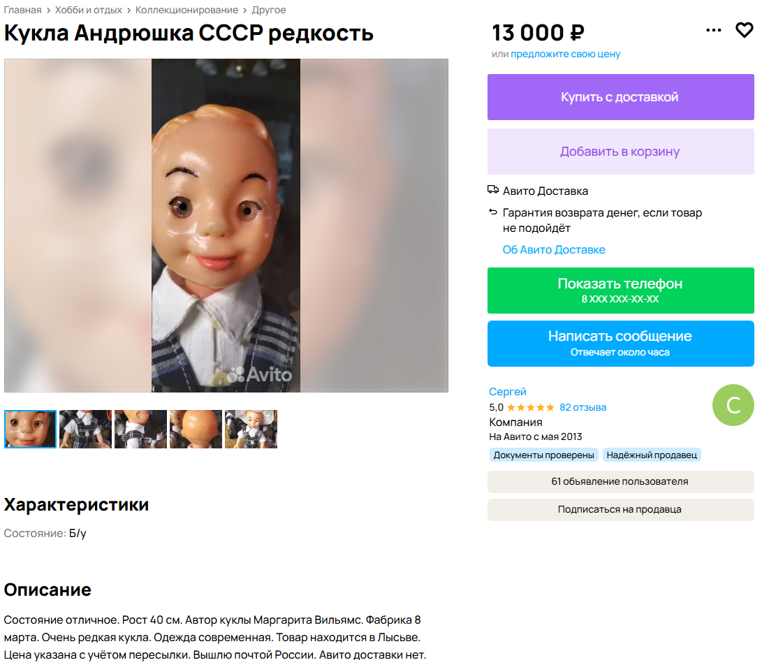 >>772641 Есть такая у мну. Дорогие куклы гдр. Думая за рубас такую продать. За 100 купил, за тыщу продам. 900 сотен прилипнет, хули. А по 100 рябчиков можно таких раритетов набрать, что потом несколько месяцев можно хуи пинать. Понимающие, да. Лучше, чем на заводе кишку выдавливать и улыбаться барину за милостыню.