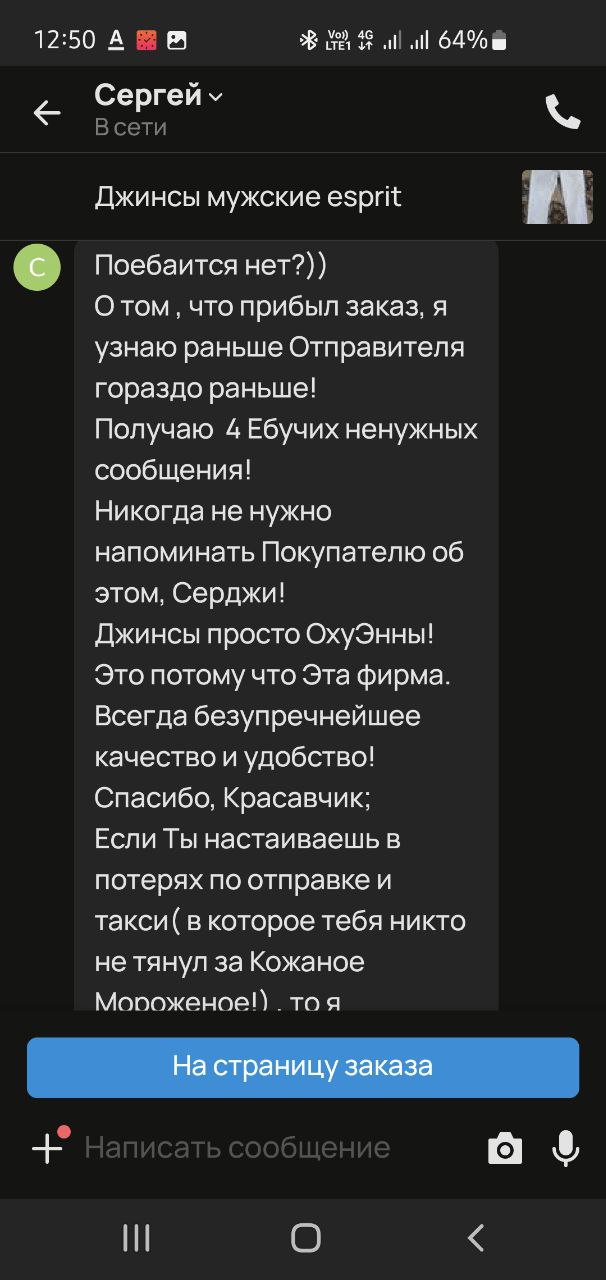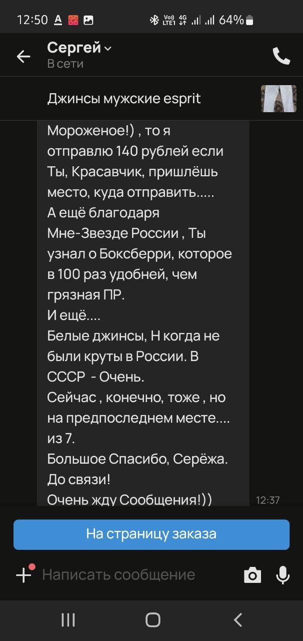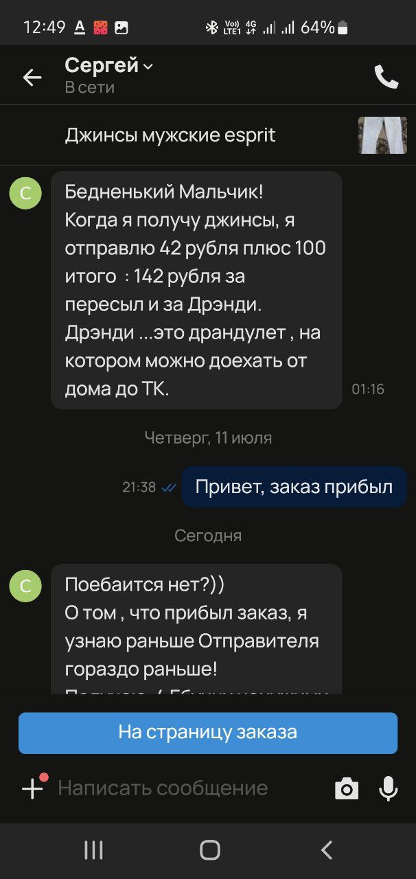 Купили телефон с доставкой, древний кал за 1500 рублей. Заказ уже 5 дней на почте в городе получателя. Сегодня я хотел ему написать и напомнить, чтобы он забрал заказ, поскольку в чате он вел себя немного странно. Душил что-то, несколько раз спрашивал когда отправлю, спрашивал виден ли мне его адрес доставки, потом зачем-то скинул скриншот заказа со своим адресом и телефоном.