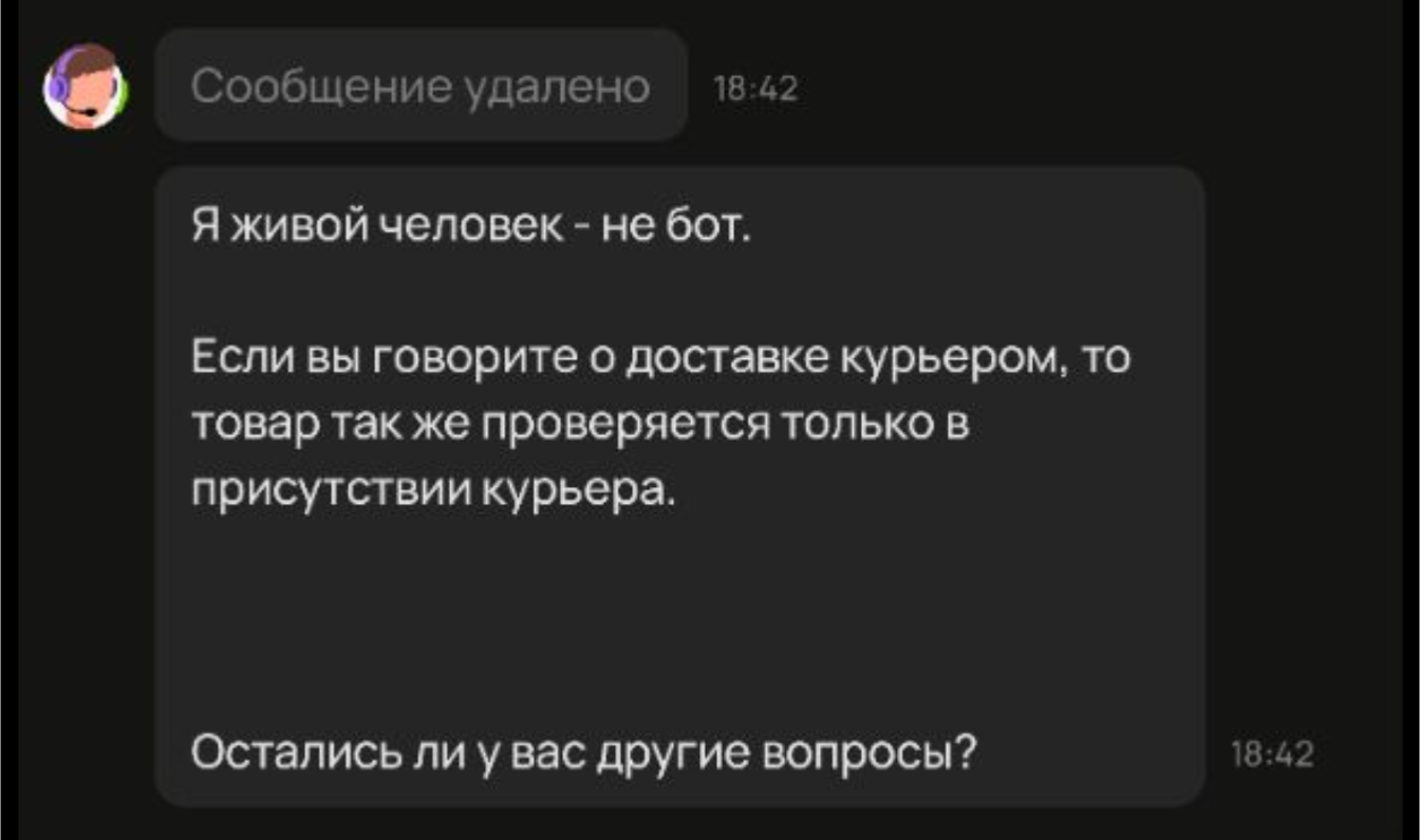 >>776019 Блядь, там нейросеть на авите, что ли? В удаленном сообщение первой строкой как в переписанном после, только: >Я живой человек - бот Без «не».