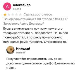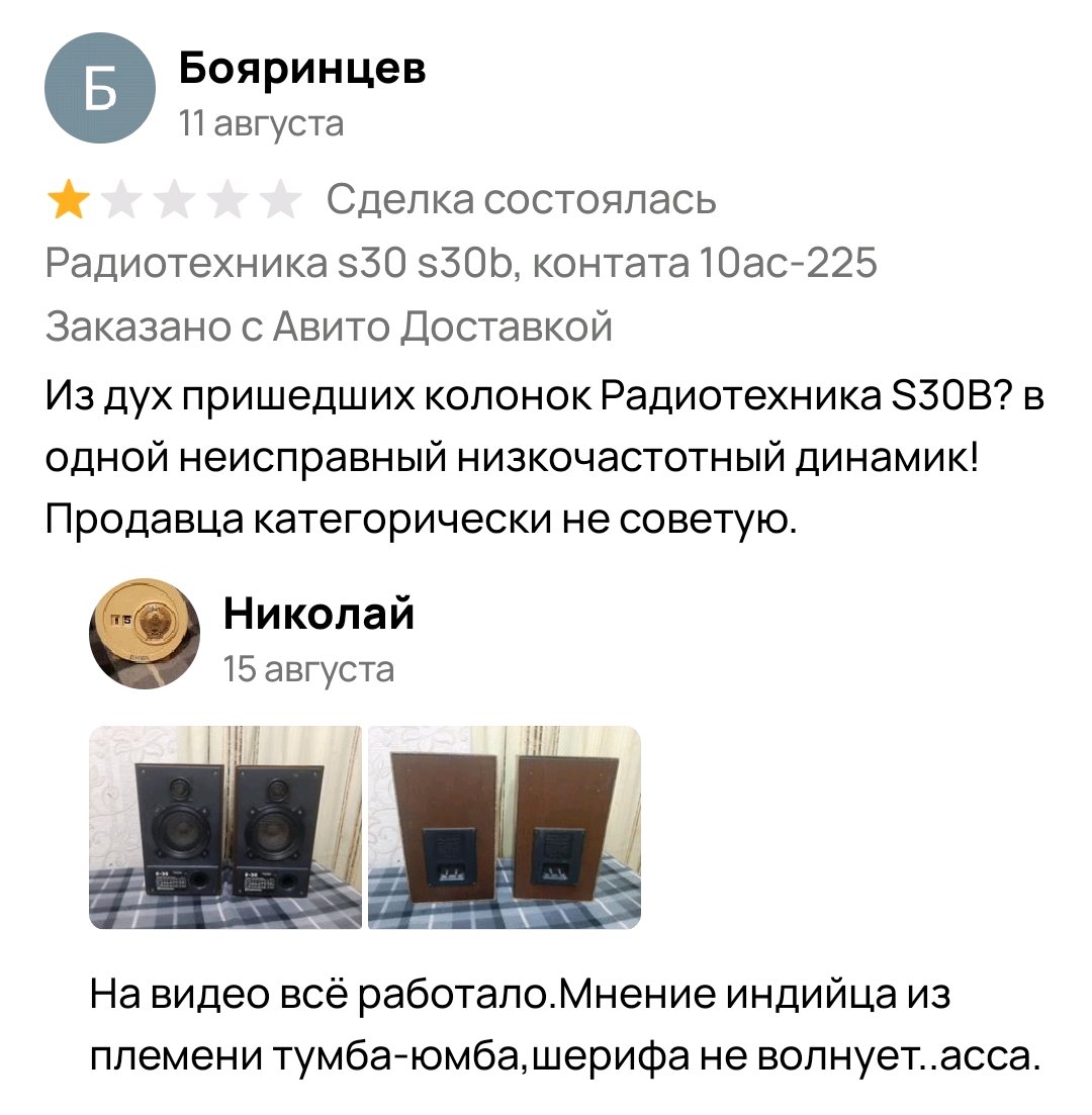 Скупает муз центры, радиолы и прочую такую поебень. https://www.avito.ru/user/0ed2ba9d39418cf1167c17a5dbaac6fd/profile?src=sharing если интересно, 52 единички, 458 пятерок, средний рейтинг 4.5. Большинство ответов на единички в стиле НЕТ ДЕНЕГ НЕ СКУЛИ, так что развлекайтесь. Всё что в единичках пишут и глядя что он отвечает я не сомневаюсь что он людей наябывает, нерабочее как рабочее это цветочки, еще выламывает всякие ценные детальки из плат и потом корпус продает как работает бля буду и тд. Одно время у него прям лоты висели типа "кондеры с золотом, платиной".
