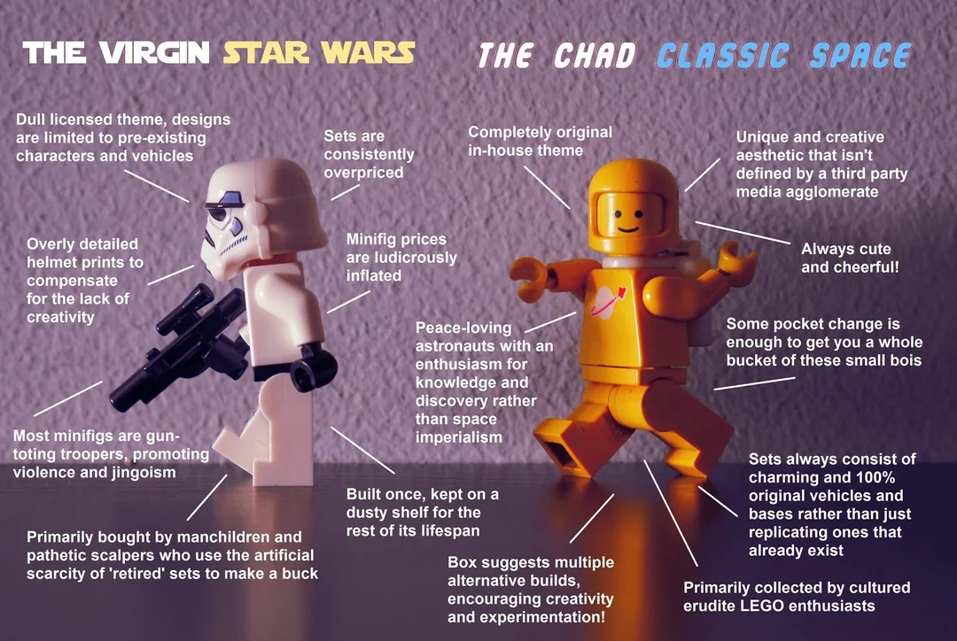>>785006 не база, Лего просекли что классик спейс теперь монетизируемая ностальгия и по факту началось такое же доение аофолов как и с звездынми воинами. "собери космонавтиков всех цветов, но некоторые из них спецом в супер-редких и эксклюзивных наборах, другие в "подарках" при покупке на сайте от 500$, а третьих надо по торсу-шлему-баллонам собирать из 3х флагманов ниндзяги и дримзз"