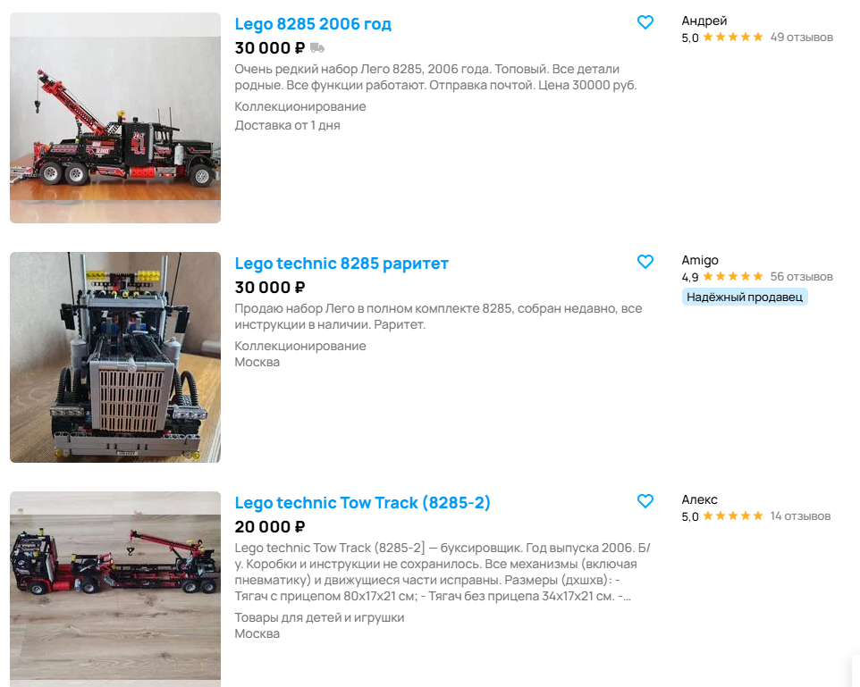 >>783458 бывают лоты с кучами деталей, по некоторым из которых можно примерно определить что за сеты там могут быть. Таким образом покупал несколько раз и восстанавливал старые наборчики. Но ща перекупов стало как гавна обычно такие кучи сметают сходу, оставляя тебе lele ninja. Очевидно, что отдельно брать какой-то сет в большинстве случаев не выгодно, а если еще под восстановление - заебешься. Брал ганшип из стар варса как-то по цене дешевле рынка, части деталей не хватало, фигурки были, но не прям в хорошей кондиции. Сам ганшип удалось восстановить достаточно не дорого, но если бы там не хватало каких-то важных деталей типа стекол сферообразных то под заказ на бриклинке это дорого. Сами фигурки от него у меня уже до этого были на руках так что я полутал второй комплект просто. В ру сегменте так вообще не факт что нужная деталь найдется и чтобы в нужном колличестве. Бтв перекупов реально как гавна, этот ганшип уже хотели перекупу отдать, но отдали мне типа в хорошие руки, а обьявление свежее прям было.