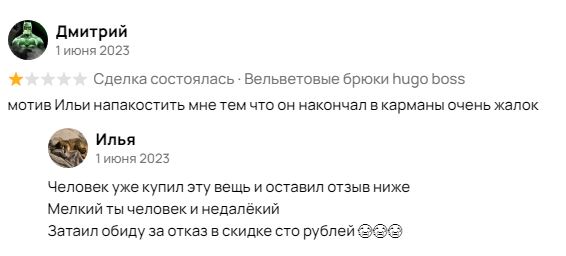 Один психопат мне все написывал в декабре, названивал, хотел доставку хуйни за 70000 которая без коробки разъебется 200%! А что бы нормальную коробку и защиту к ней сделать, это еще косарь сверху и ебля с плясками, а если разъебется то авито точно не вернет мне все 70к. Ну короче этот ебалай все написывал, названивал, потом въебал отзыв не идет на встречу клиенту! который я отбил, хоть и не с первого раза.