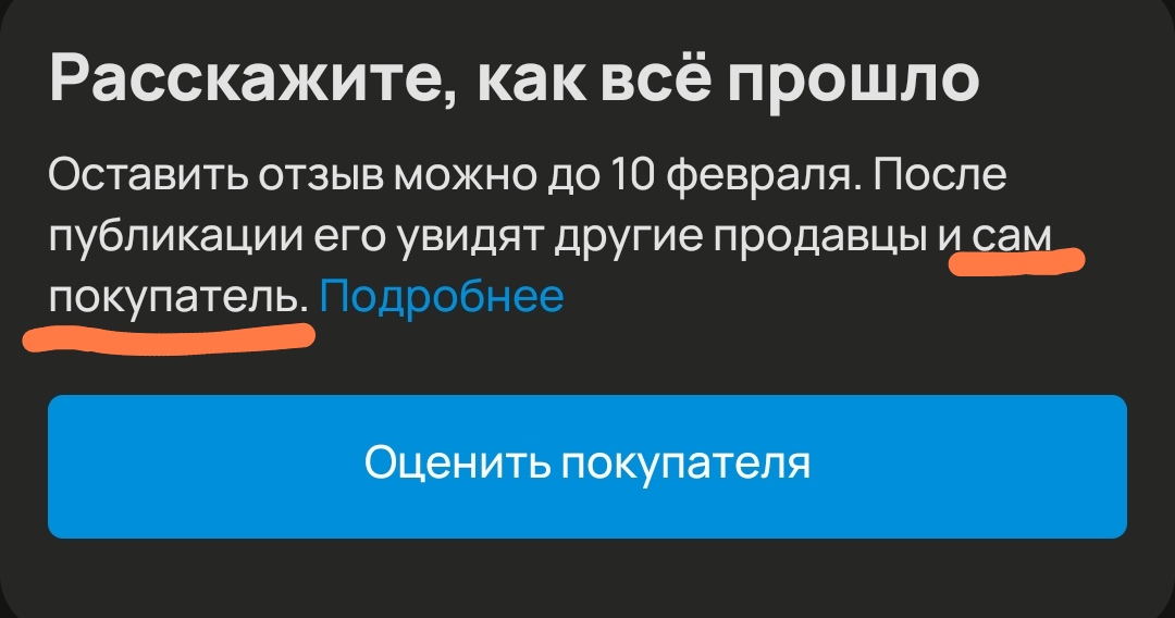 >>793656 >Лизать клиенту жопу и делать вид, что тебе нравится. Это все про вот пикрил. Авито даунов покупантов проучить - сам бог велел. Я всегда своим пишу, что после того как посылка будет в пункте выдачи, у них есть три дня что бы её забрать, то что им авито дает две недели меня не ебет, я жду три дня и отзываю доставку, пару раз пришлось этим воспользоватся, заставляет покупашек быть в тонусе.