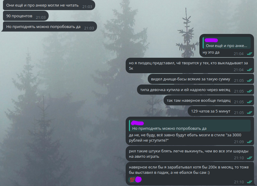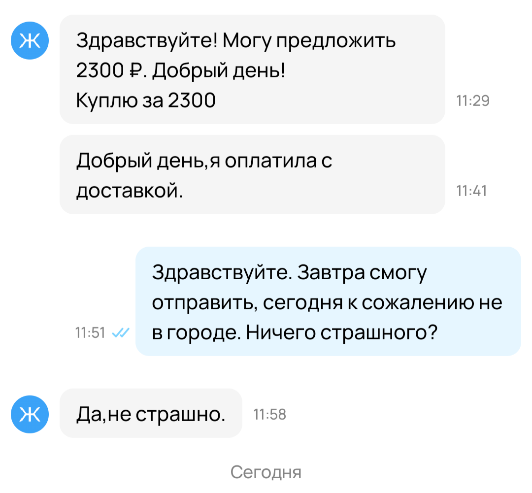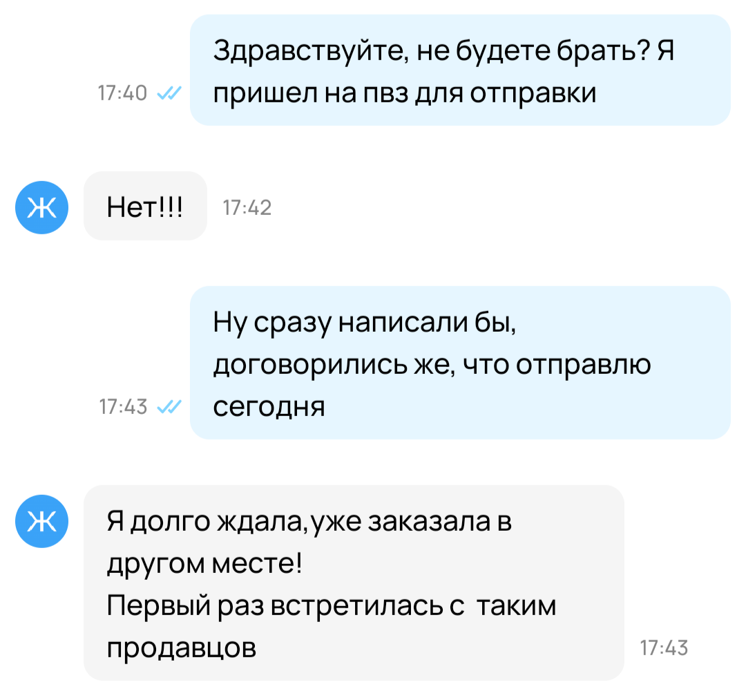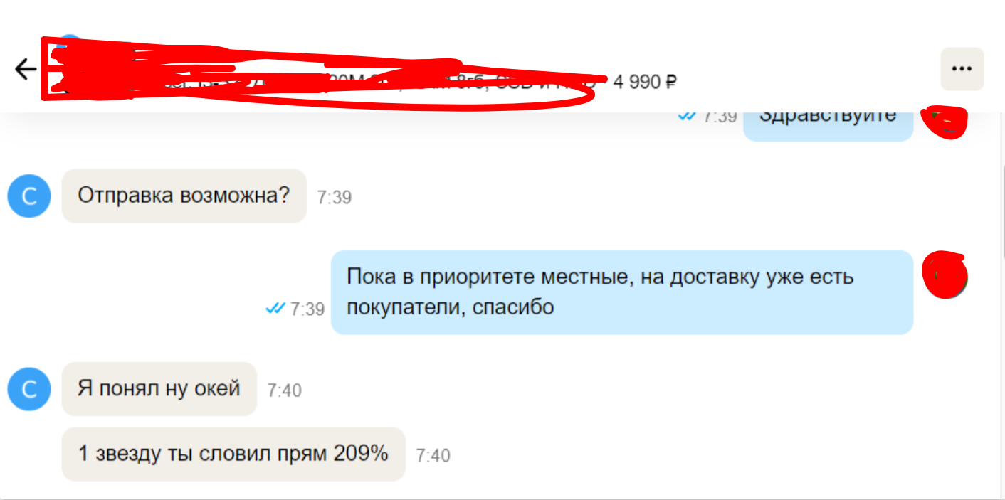 4. Заказ авито доставкой. Аккаунт с нормальным рейтингом, есть активные объявления и живые отзывы. Отправлено, пришло в срок. Остаётся 24 часа до конца хранения, пишу мразоте, когда она заберет. "Ой, вы знаете, мне так далеко ехать до пвз. А вы мне еще и в цене не уступили. Давайте вы мне 300р хотя бы на такси переведете ладно??"
