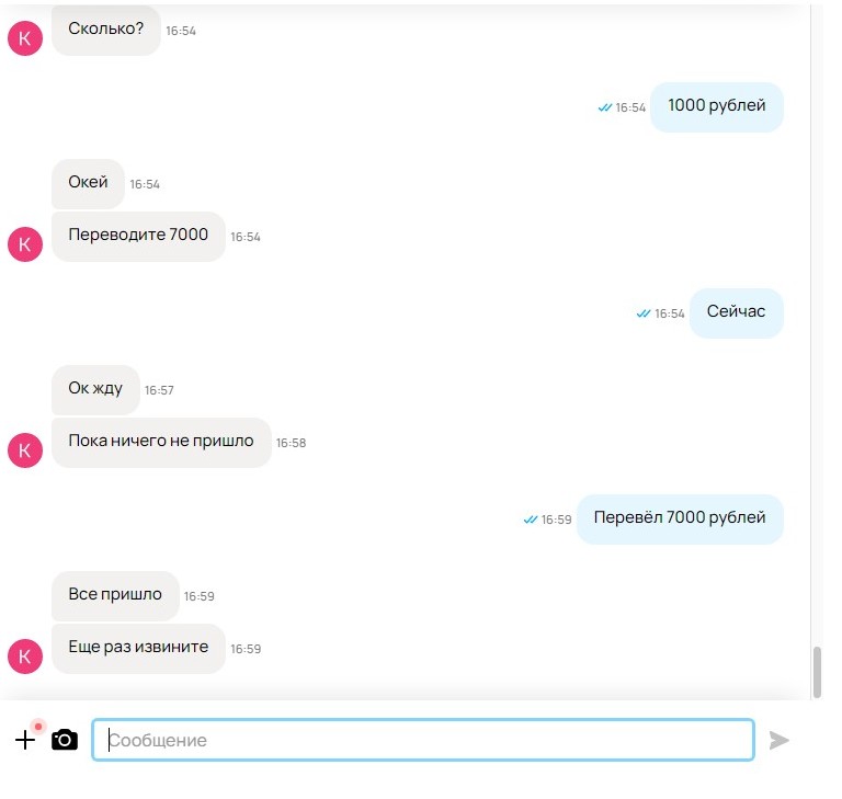 По номеру карты с комиссией перекидываю, спрашиваю дошло? Нет не дошло. Ладно говорю ждем до завтра, завтра точно дойдет. Завтра уже прошло позавчера, сообщения не читаются.
