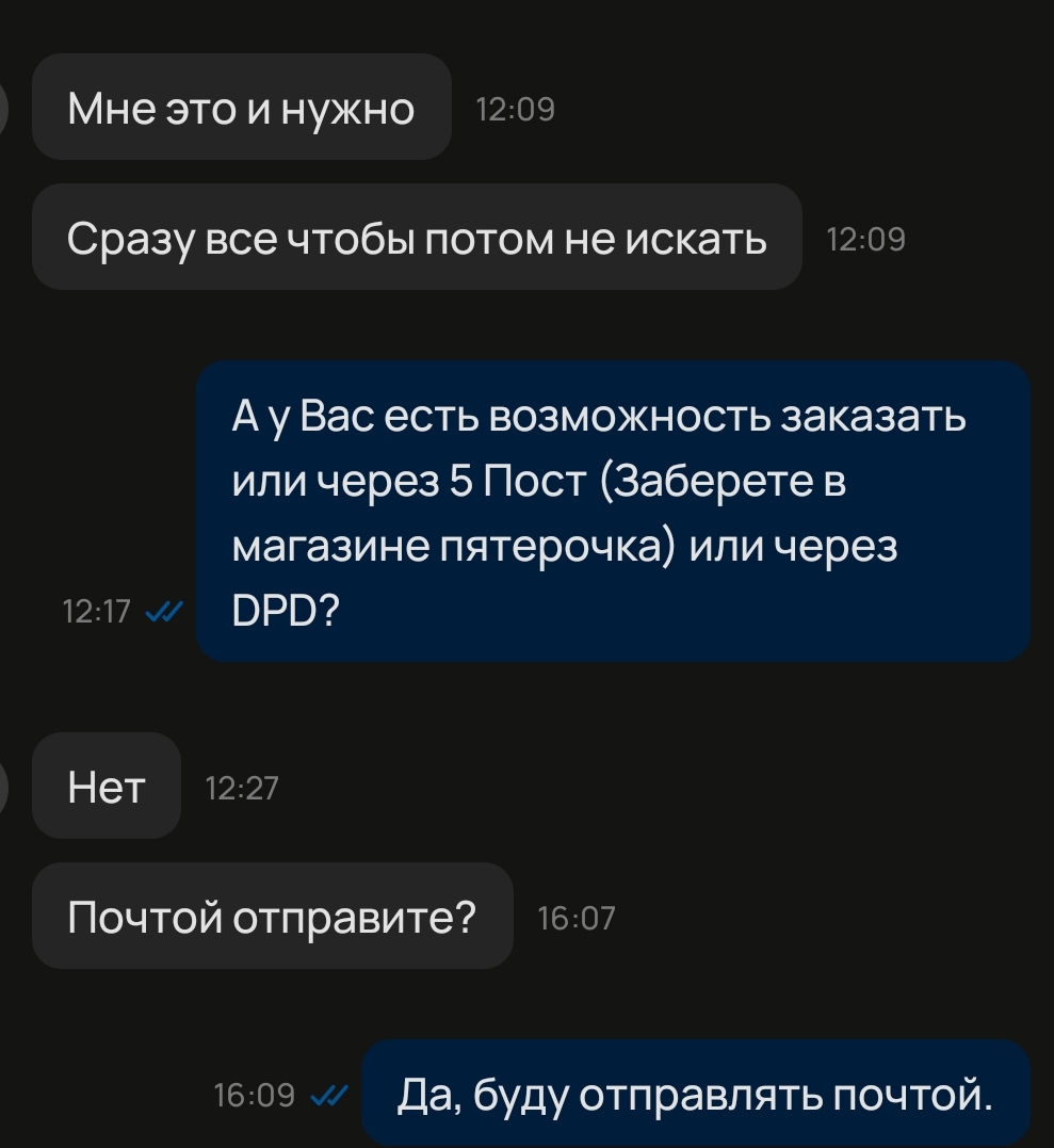 Заказал мужик, судя по всему пожилой или тупой. Я на следующий день понес, отправил, все хорошо. Прошло 3 дня, мне этот мужик пишет ну что отправили нет?! блять. В такие моменты просто хочется отменить, я чую кучу проблем. Щас он получит, окажется что объявление не читал и я заказывал другое!