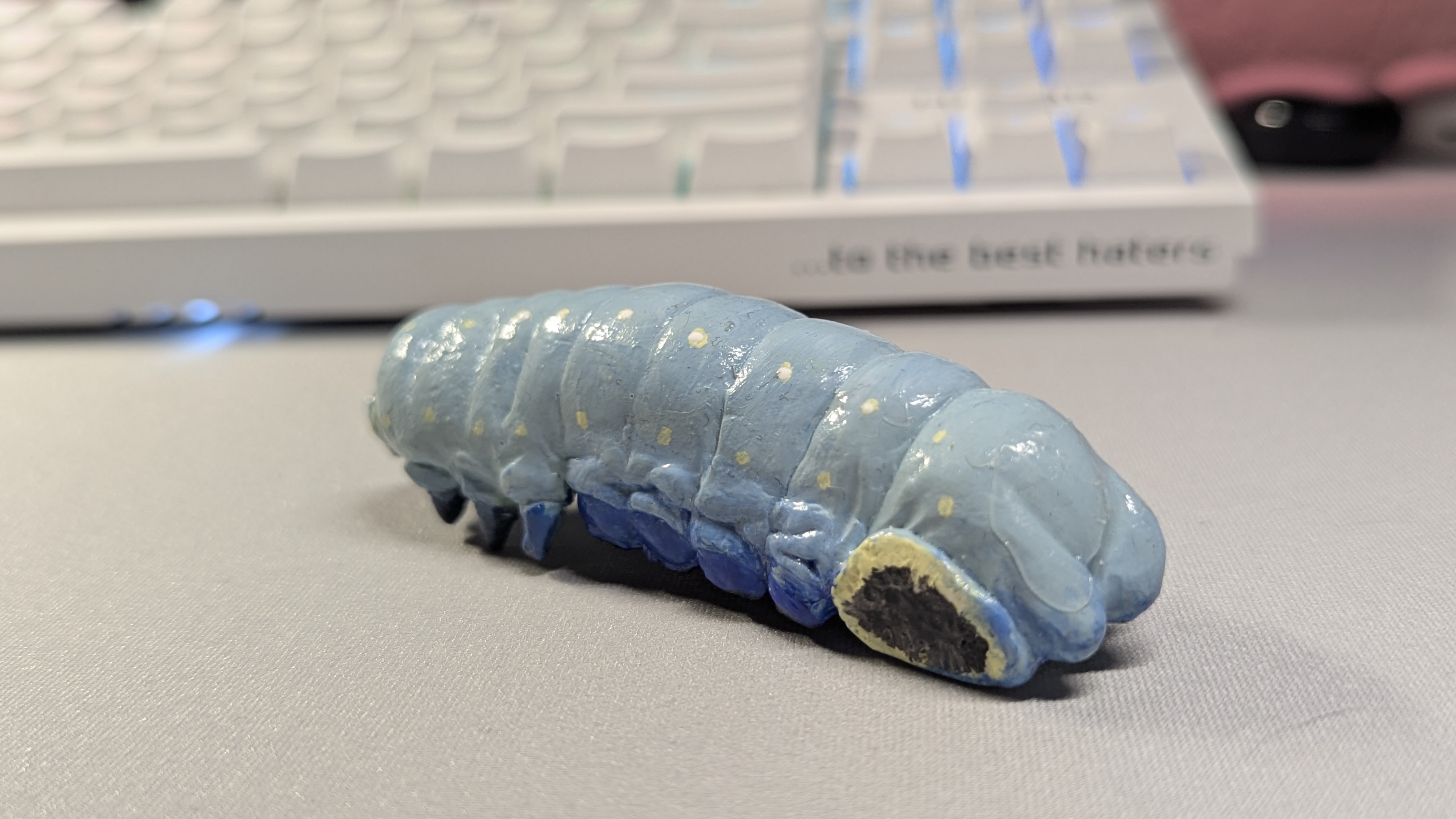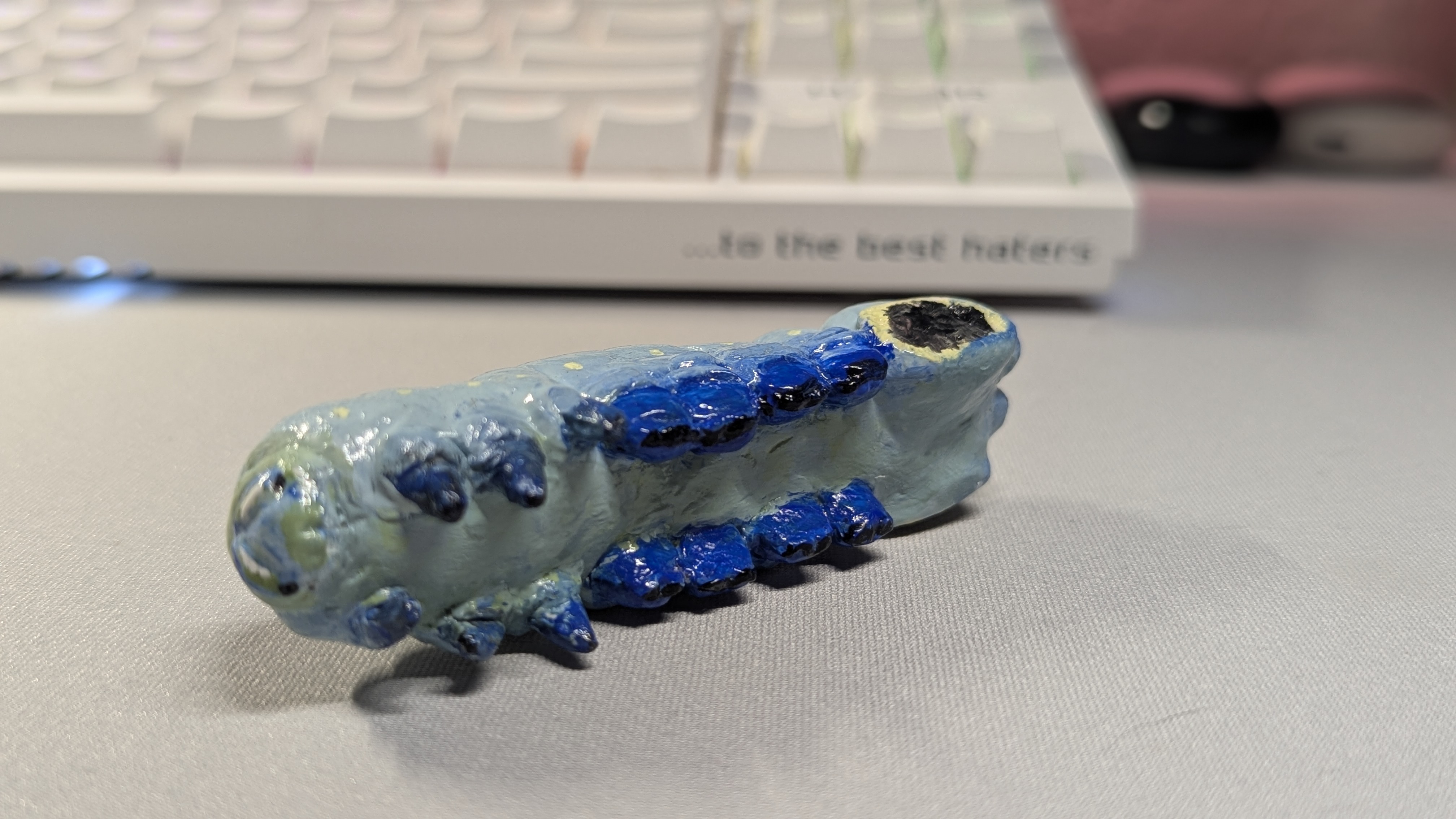 Рейт мою гусеницу. Первый раз лепил из полимерной глины. В процессе когда покрывал лаком налипло куча ворса(из воздуха я хз) и в двух местах затвердел стекший лак. Как этого избежать? Подвесить ее как-то что ли?