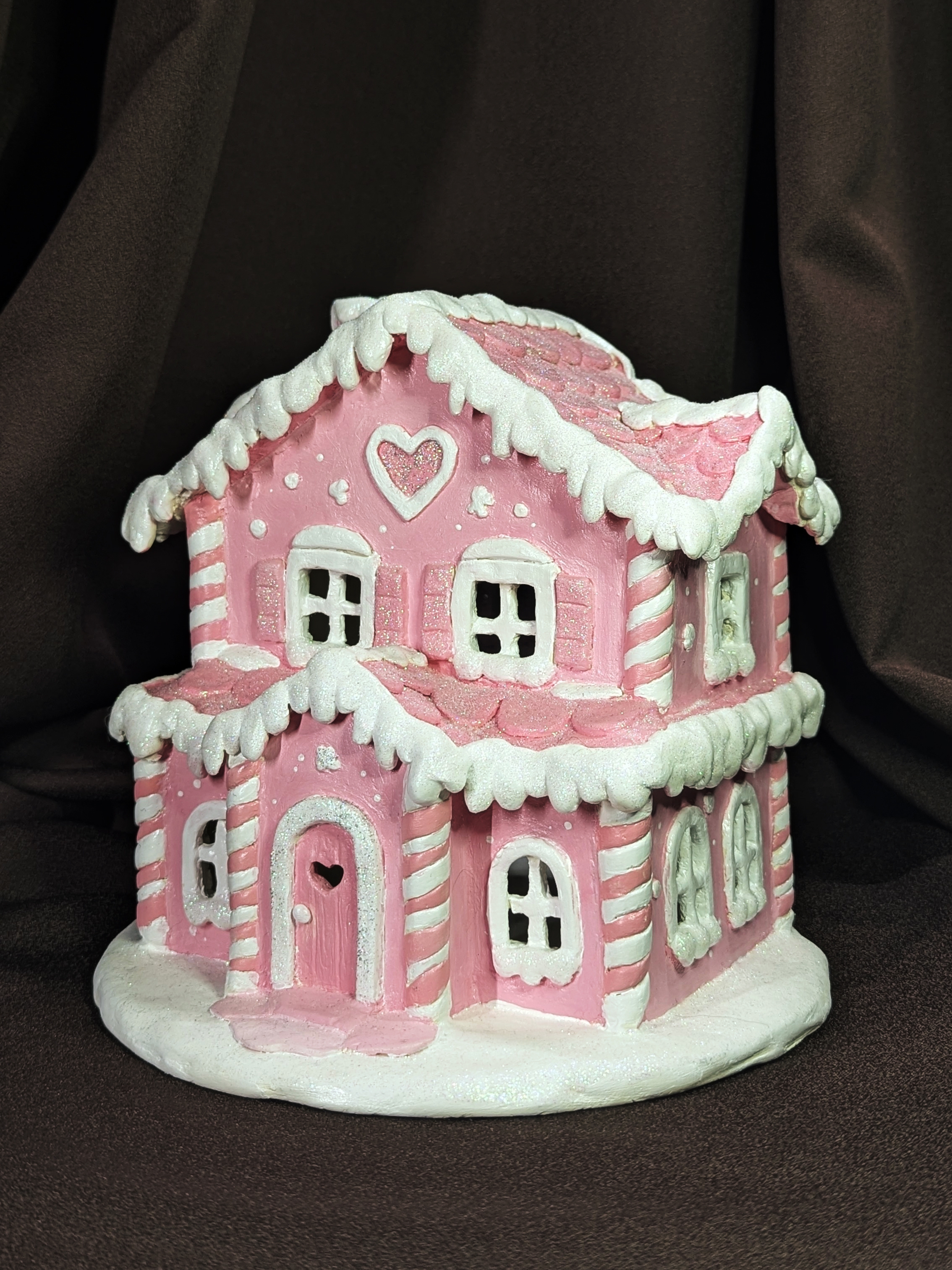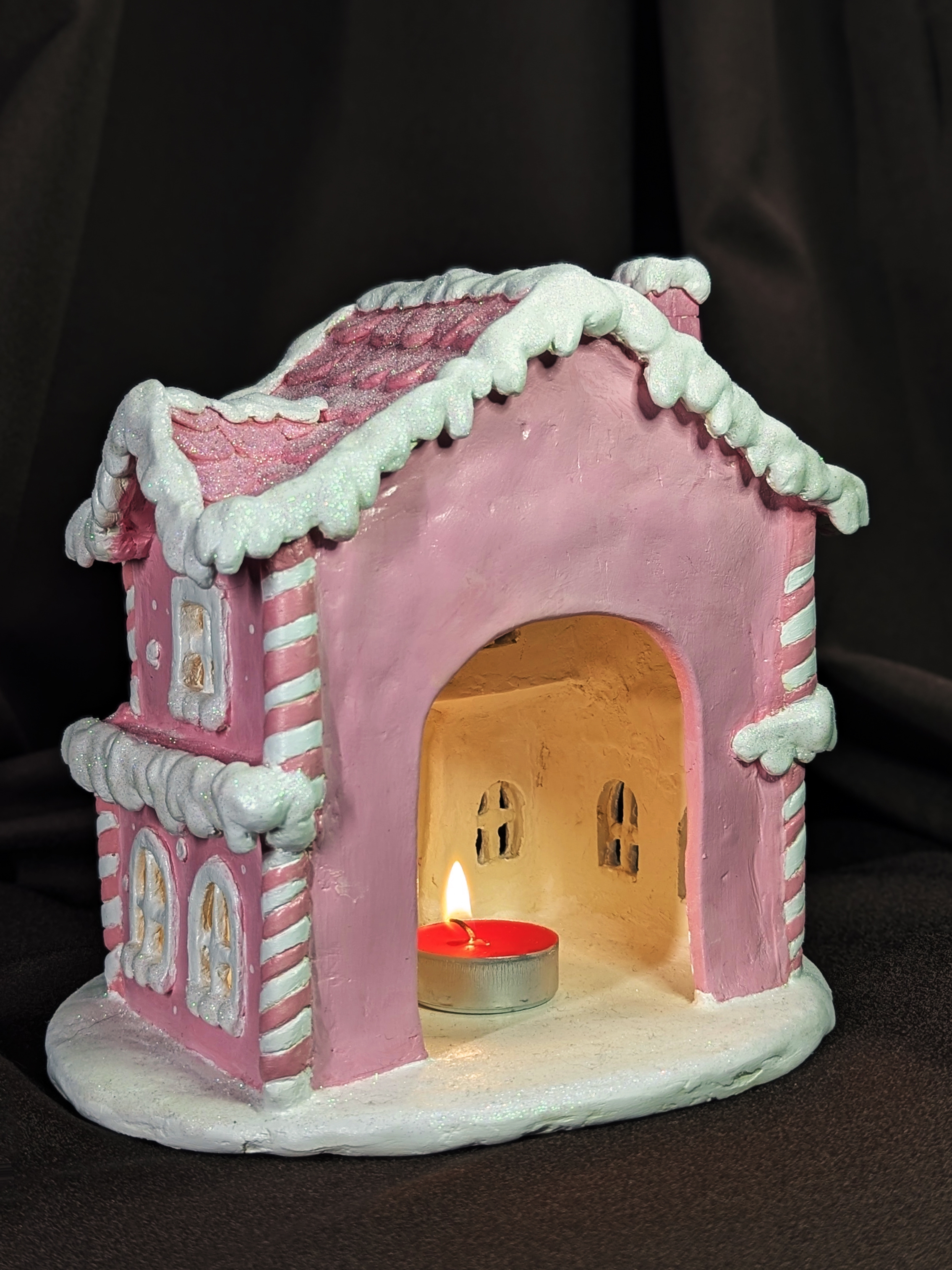 Сделал подсвечник-домик для мамы. Ворс из воздуха продолжает беспощадно прилипать к краске и лаку. Еще после покрытия лаком блестки умерли, но уже решил не переделывать, потому что и так потратил 2 недели на него. Опыт конечно интересный, но никогда больше
