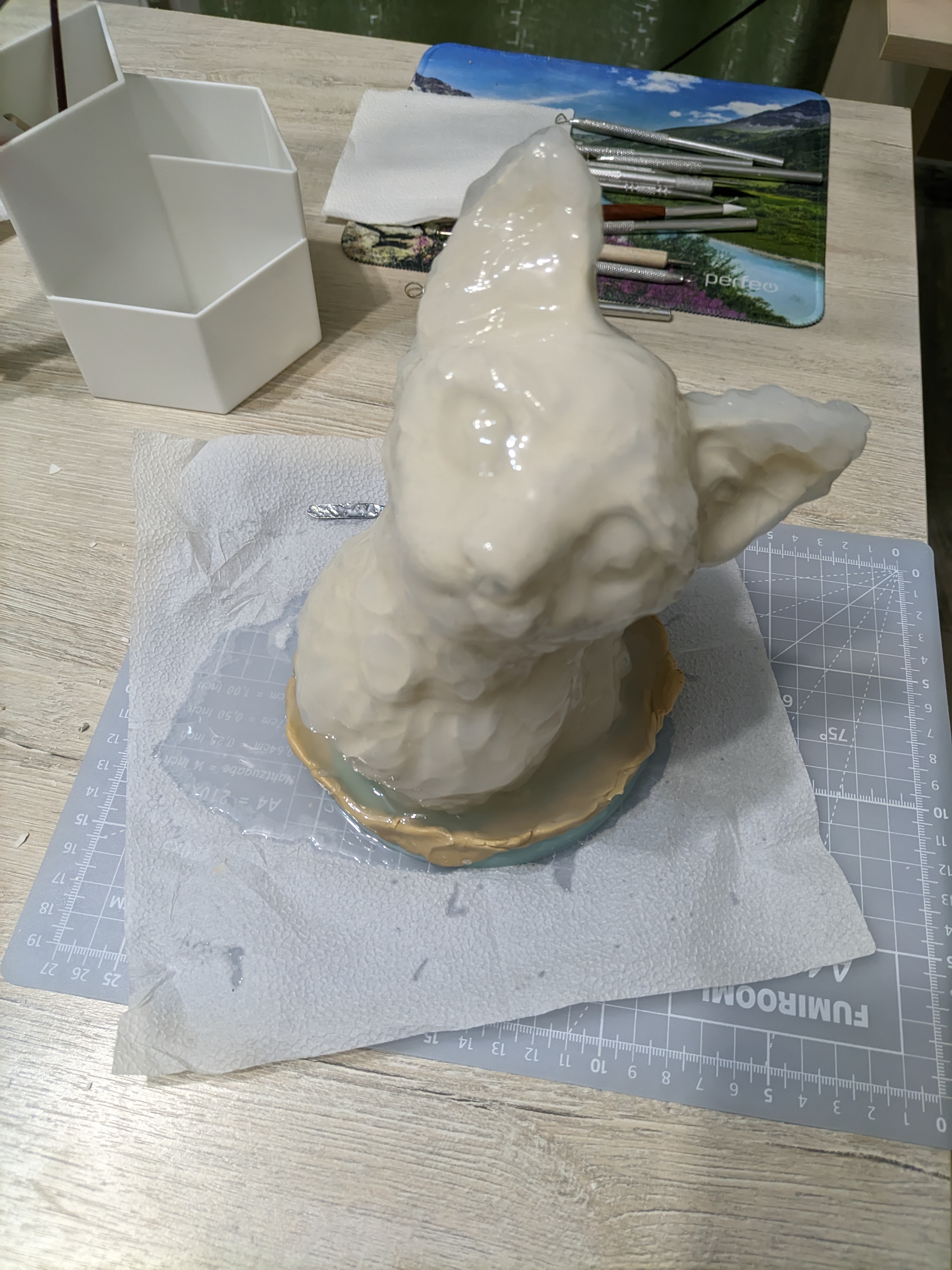 практически доделал кошку, я уже не знаю что с этими микрокатышками делать, уже еле-еле касаясь выглаживал, пробовал и силиконовую кисточку и растворитель галошу, все равно они остаются. делал из ск. пластилина впервые, и взял на эту пробу мягкую гамму, в процессе уже 10 раз жалел, что мягкий. и вообще она какая-то, хз, к пальцам не особо липнет, но к любому инструменту еще как и катышки эти от него же. не пробовал только горелку, но хз, она небось поплавит вместе с ними острые углы, а я хотел чтобы они тоже выделялись.