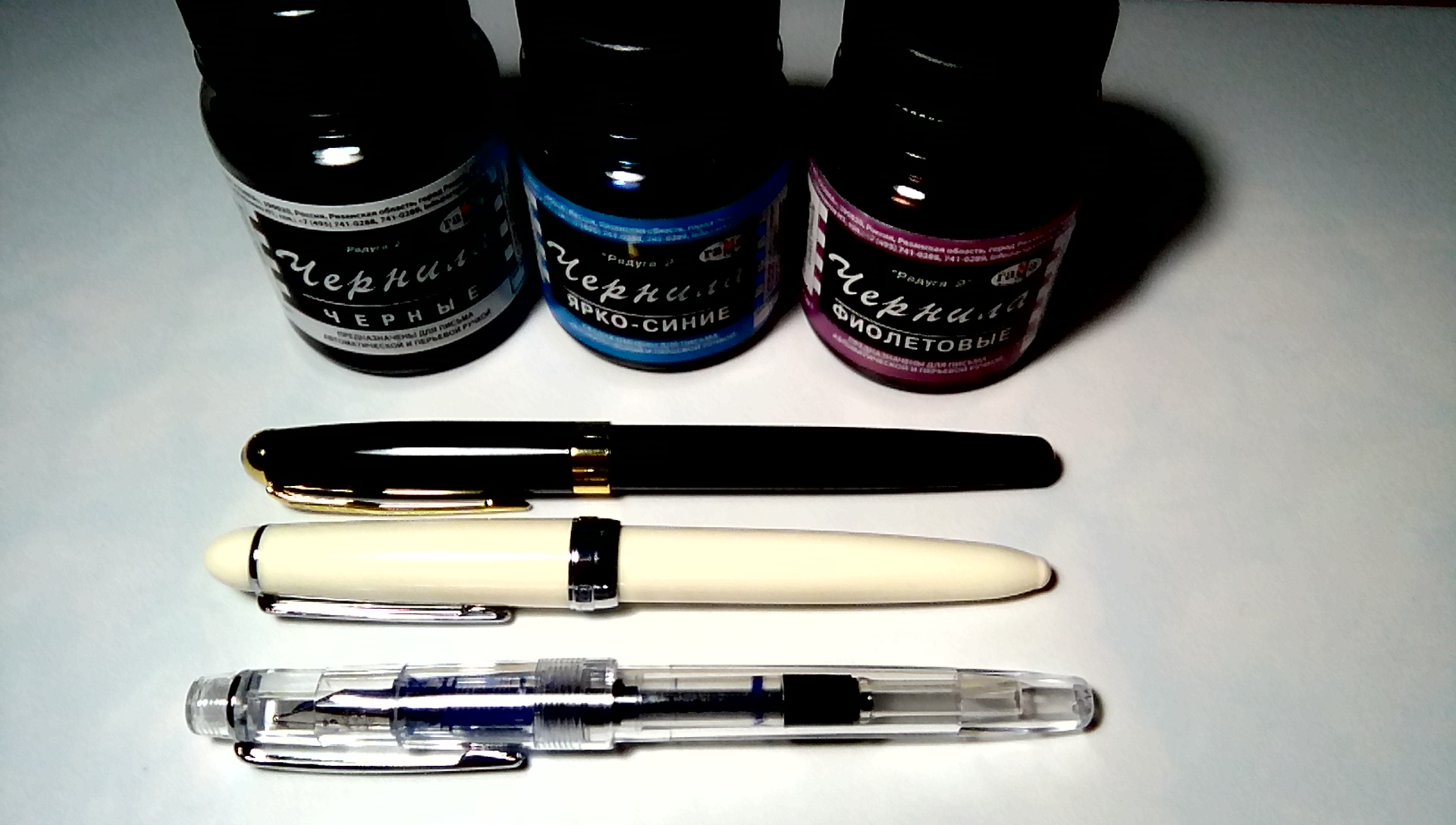 В общем, купил чернила от Малевича - фиолетовые, синие и "Сердце океана". Обычные такие чернила-нормисы за свою цену. Фиолетовые сочные, не красят ручку, как это делали фиолетовые от Радуги-2(но из-за этого у Радуги-2 и водостойкость лучше). Думал, что "Сердце океана" будут эдаким тёмным ультрамарином, но оказались обычными чёрно-синими(примерно как чёрно-синие Паркер). Ну а синие они и в Африке синие, чуть темнее Радуги-2. Пишут все чернила нормально, не такие сухие как тот же Пеликан. Прям чувствуется, как скользит перо по бумаге. Фиолетовые и синие практически не пахнут, а вот у "Сердце океана" прямо чувствует запах как у гуаши.