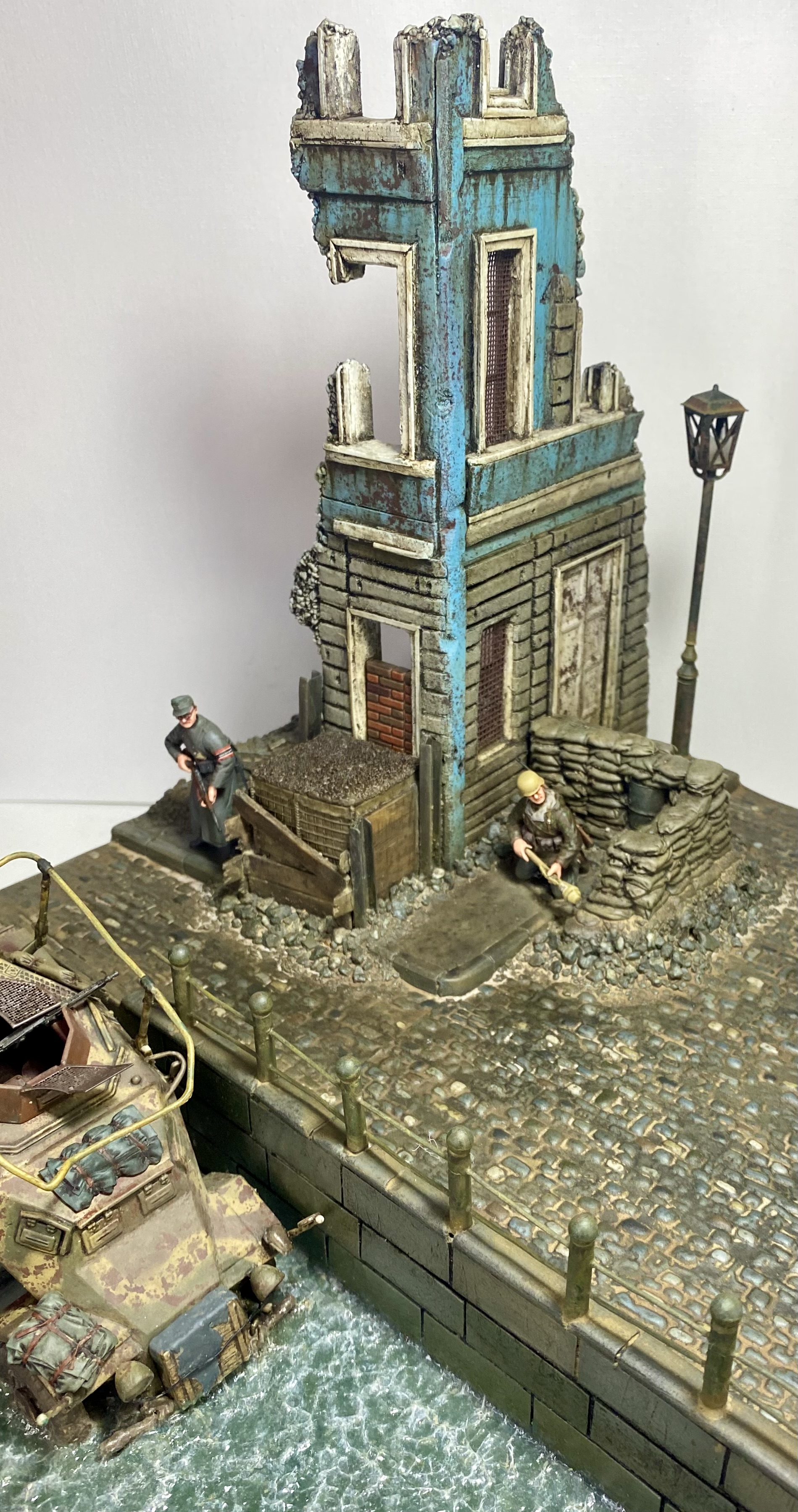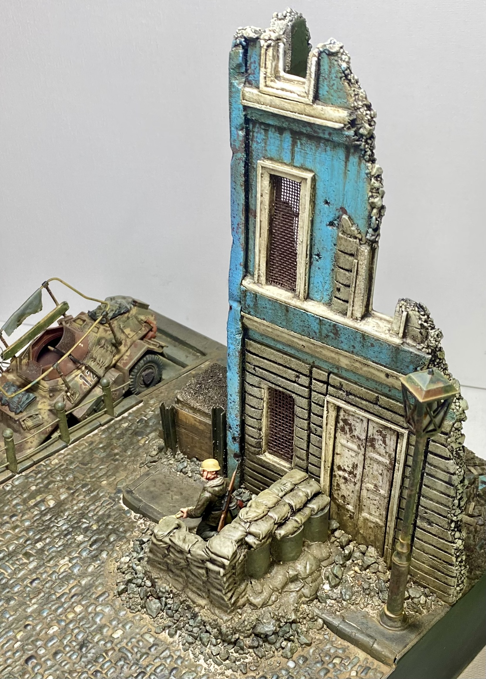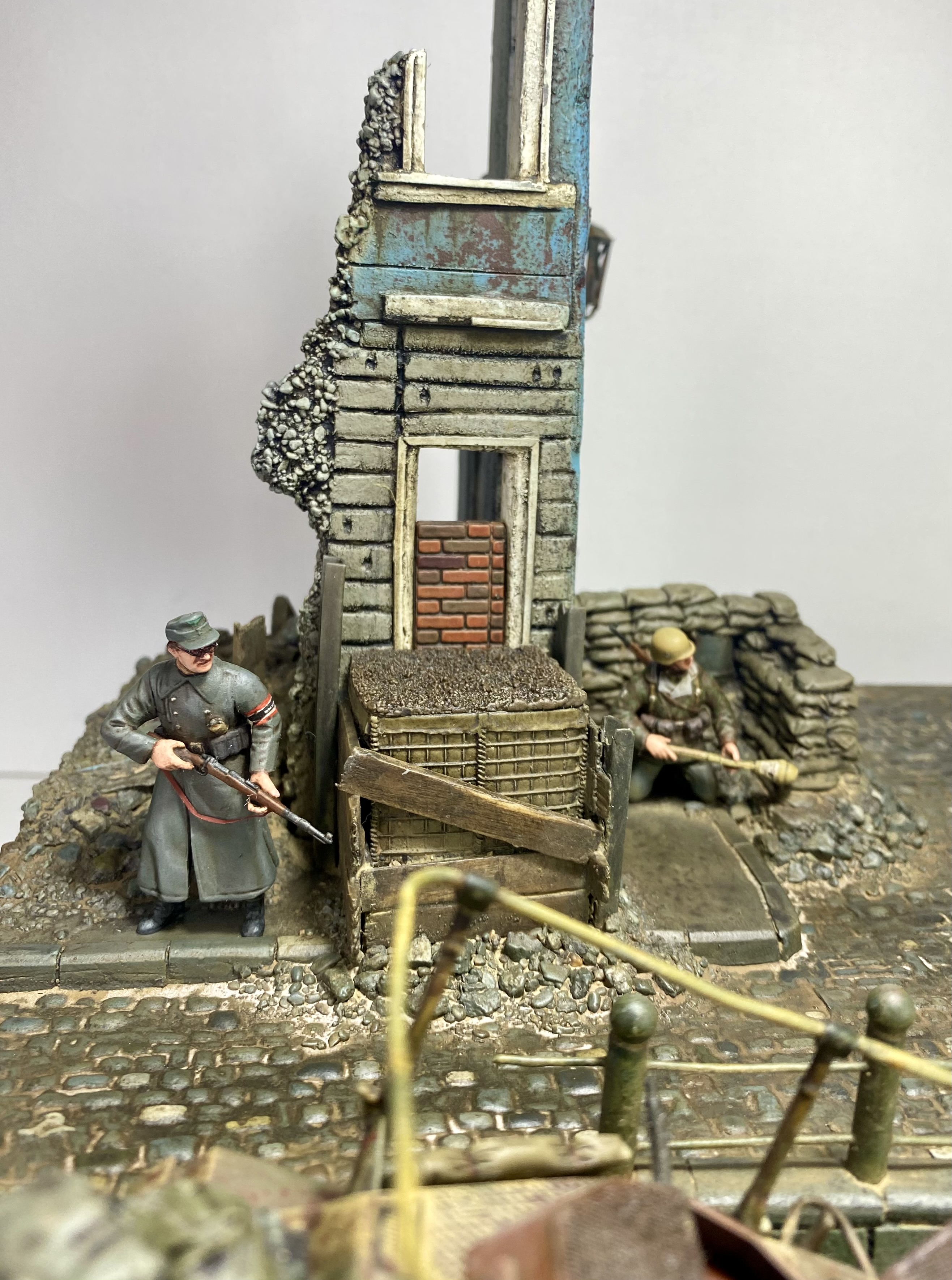Продолжаем строить диораму, на этот раз контент с домом и забором. Пока только окрасил акрилом и слегка припылил пространство между кирпичами пигментами.