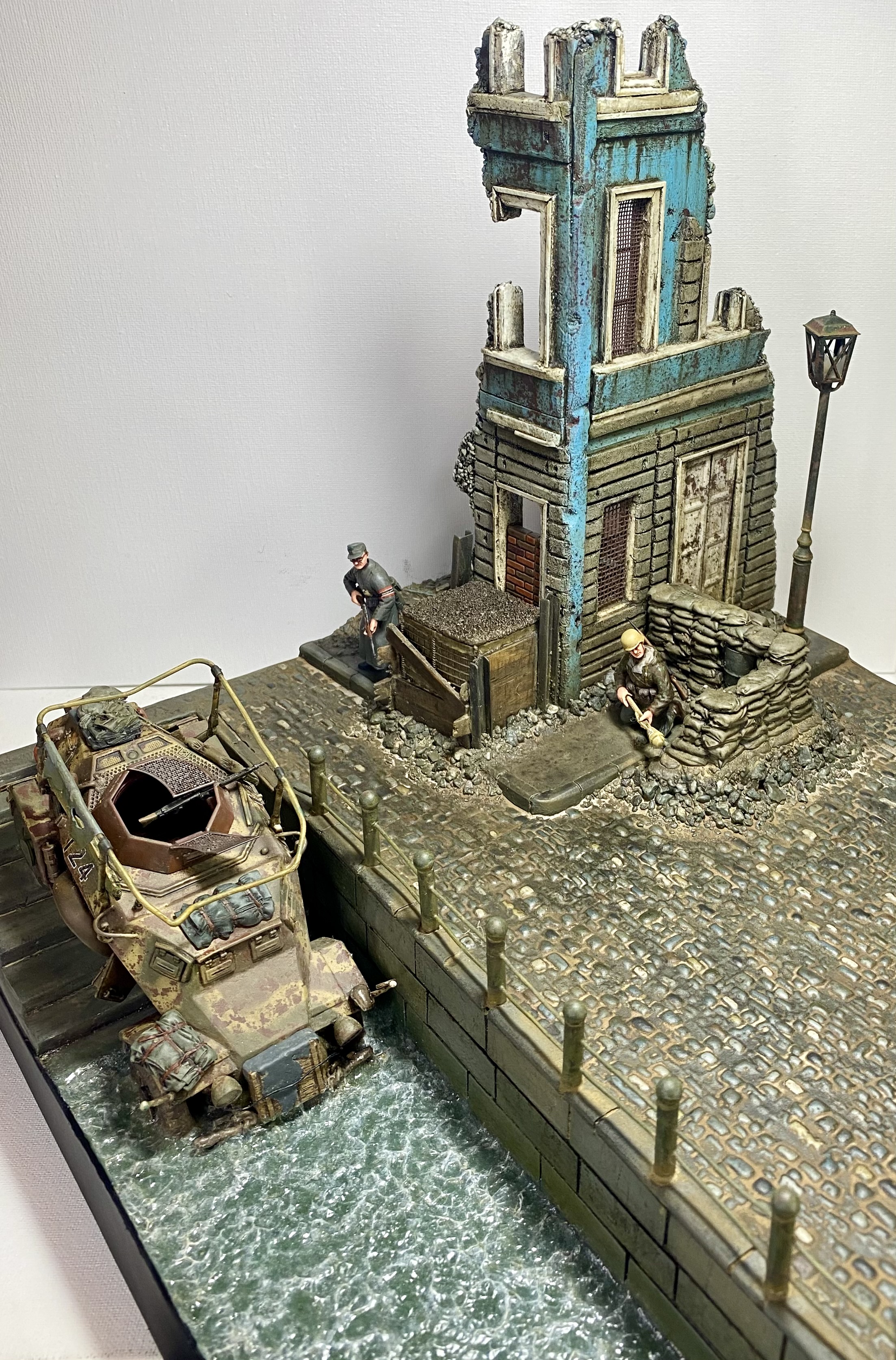 >>808021 Я буду тут по возможности выкладывать процесс. Вот например формирование грунта во дворе. 1. Ограничить зону нанесения масклентой 2. Смешать звёздовский (его не жалко) акрил в земельный цвет 3. Помешать две ложки пасты в краску 4. Нанести широкой кистью на поверхность 5. Обсыпать смесью модельного песка и очень мелкой гальки 6. Покрыть поверхностью смесь 50 на 50 пва/вода Оставить сохнуть на ночь, после высыхания покрасить аэрографом в подходящий диораме цвет.