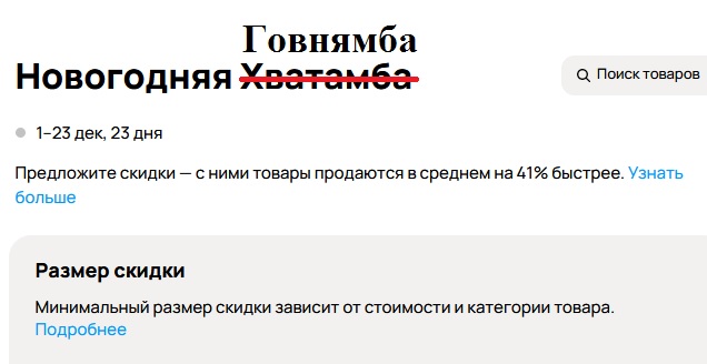 Говнито анонсировало новогоднюю говнямбу. В августе была норм акция, когда значительно уменьшили комиссию с продавца за продажу. Сейчас и новогодняя просто говнямба, жадные ублюдки из говниты.
