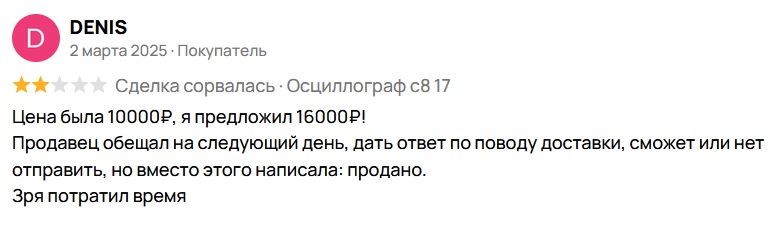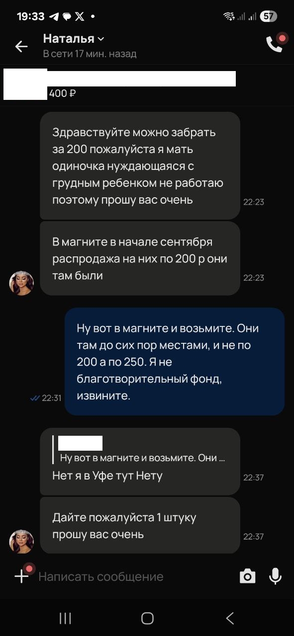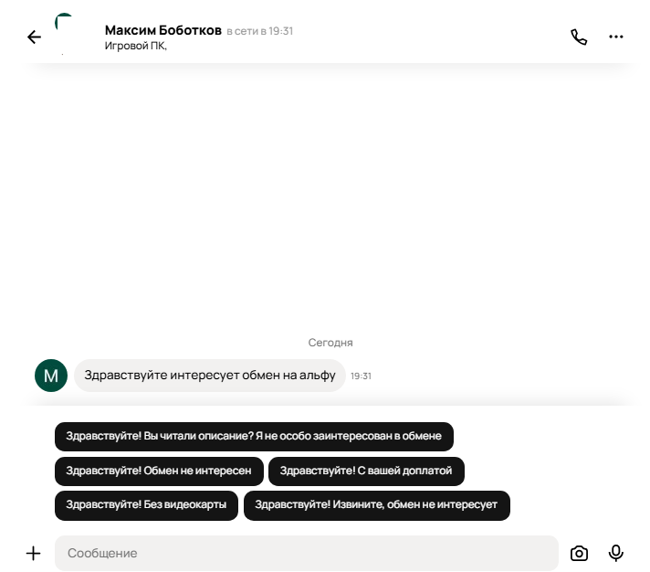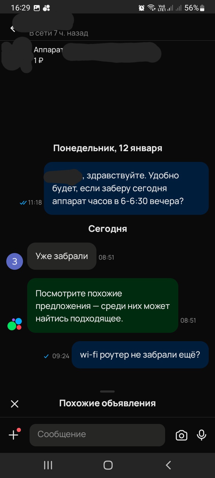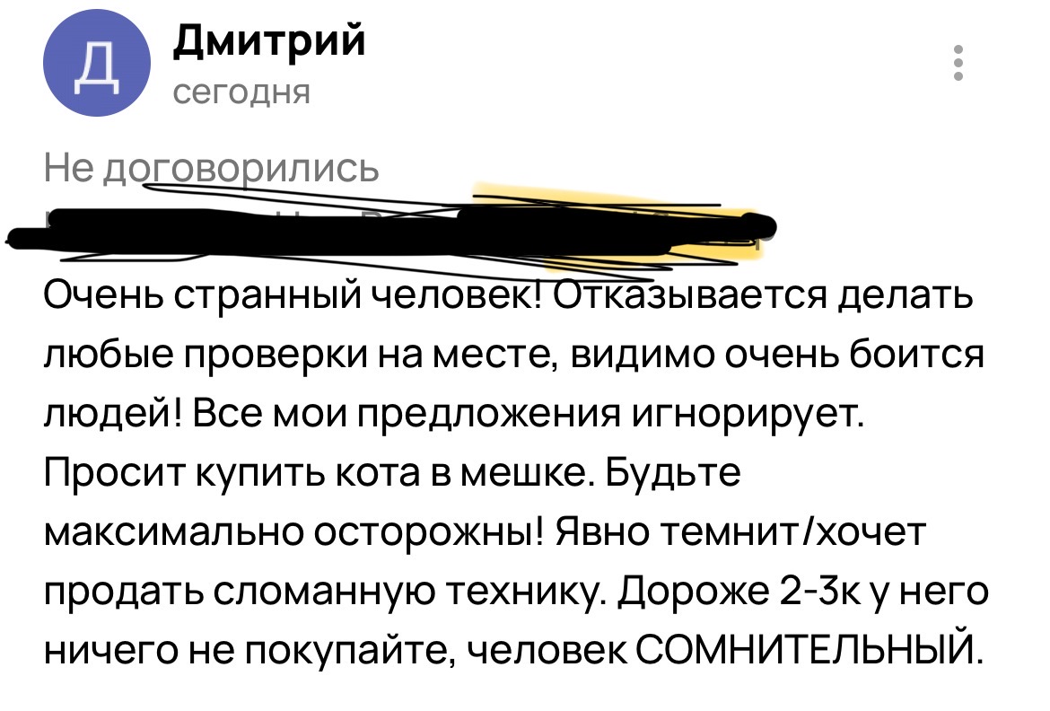 Вот буквально диалог пары дней назад. Чел пишет, задаёт вопросы и пишет в конце Возьму, но ещё хочу вот ту пердолу. И пишет мне в другом объявлении уже. Я там ему ответил на вопрос и пишу в том где он сказал Возьму - давайте бронь вам поставлю, чтобы другой не купил. И что ты думаешь? А ничего. Он просто перестал отвечать по середине диалога. Вот просто не ответил и всё. Т.е. ему больше неинтересно при том, что он сказал что уже берёт. Чем ты от него отличаешься? Телепатов нет, что вы там хотите.