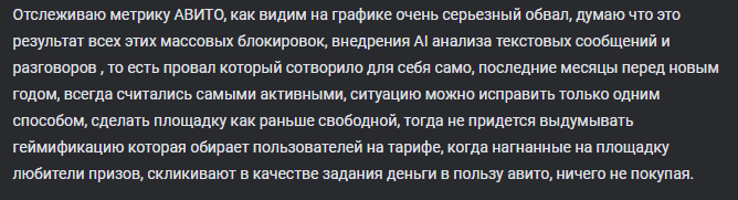 Чот Авито быкануло на моё объявление по поводу достоверности цен, решил немного поменять цены описание, в первый раз после проверки написали типо дохуя товаров продаёшь и ваще мы заметили, что ты пользуешься одним объявлением для регулярных продаж и поэтому оно будет платным. Я если честно пересрал, потому что ладно бы платное объявление, заплатил и в хуй не даёшь, но эти ебучие лимиты контактов, которые за пару дней заканчиваются, а потом опять плати... Ну короче вроде исправил всё как-то, опубликовалось. Ща прикол такой, что просмотры идут как и раньше, а люди уже не пишут. Раньше по 12-15 человек было, сейчас 1-2. Это явно не просто совпадение. Эти пидоры всегда походу накручивали просмотры, а сейчас у них какой-то алгоритм сломался и меня кинули в теневой бан, но забыли отключить накрутку просмотров. Ладно, хотя мб я шизло, ещё недельку понаблюдаю