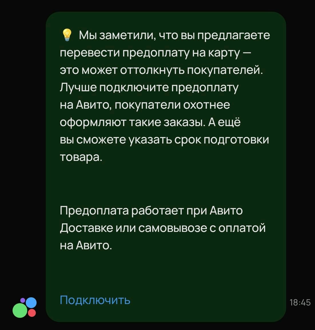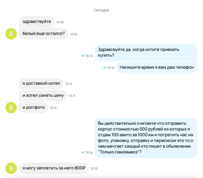 В: На авито приходят сообщения типа "еще продаете" или "отправите доставкой", отвечаю и дальше меня всегда игнорят, как быть? О: Гении из авито сделали кнопки для начала диалога, покупатель случайно их нажимает. Терпи.