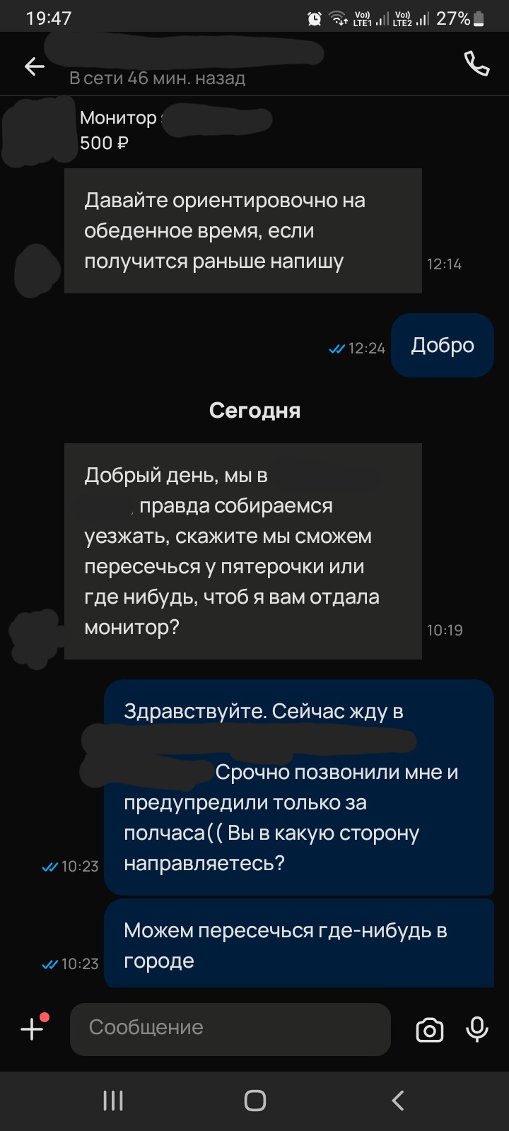 У меня абсолютно уникальная рофленная ситуация с которой я уже сам ловлю кайф. Покупаю одну пердолу за 10к, первый раз (2 месяца назад) написал челу, все ок, вроде договорились. Но потом у меня появились дела я отложил, написал через неделю, чел молчит, ответил спустя неделю, договорились, но в день икс он не ответил, написал спустя МЕСЯЦ типа может я заберу таки? он не вопрос Адрес приезжайте сегодня. Уже собирался написал "выезжаю какой подъезд" молчит, естественно не поехал. ЧЕРЕЗ МЕСЯЦ И НЕДЕЛЮ, готов привести к метро, я ок но приболел, не смог. ЧЕРЕЗ МЕСЯЦ И ТРИ недели, уже все договорились, все отлично, и тут и у него и у меня в один день появились срочные дела. ВОТ ТАК Я 2 месяца не могу купить вещь.