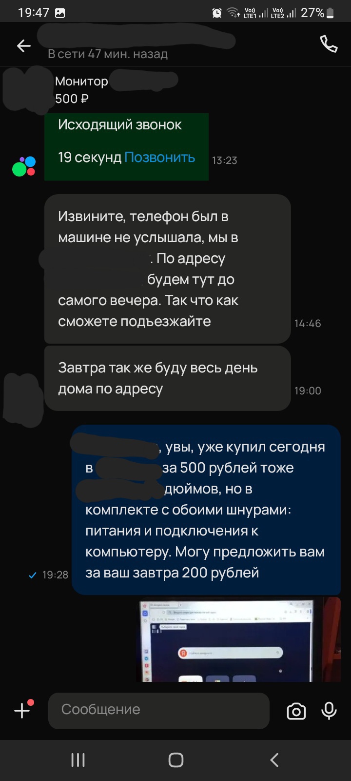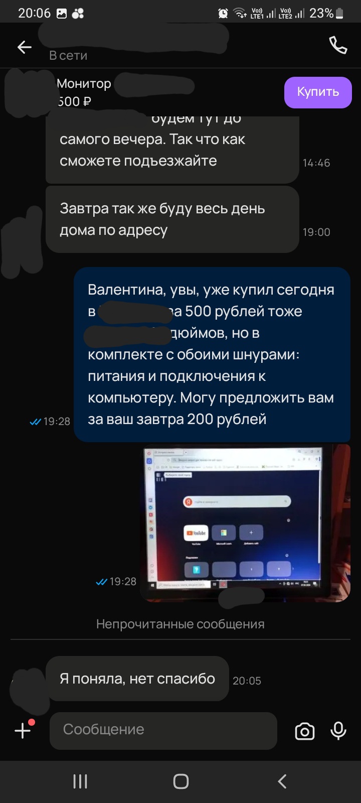 >>824824 Пока что больше офигевших барыг я вижу на авито, особенно много таких как раз среди обычнейших расхламляющихся Михаловн да Петровичей, которые по рыночной цене хотят продать недокомплект, не отвечают на сообщения и не берут трубки. Даже не говоришь и не пишешь им о скидках, соглашаясь на отсутствие кабелей и шакальные фотки, лишь бы приехать и забрать сегодня-завтра, чтобы не ждать доставку озона. Например, ещё в начале недели договорился с одной теткой о том, что куплю монитор в субботу, так как она была не в городе. Без каких-либо кабелей, работает или нет - Наверное, рабочий, - раньше вроде работал. Вчера сама предложила подъехать сегодня на другой конец города примерно в обед. Часов в 10 утра пишет, что сейчас они с семьёй уезжают в соседний город, поэтому в обед не получится, но возьмут пердолу с собой и на обратном пути, через часа 3, смогут продать мне. Ладно, тогда пересечемся в центре часа через 3... Минут за 40 не читает сообщения и не берет трубку, в оговоренное время - то же самое, ещё через 2 часа - ни "Извините, у меня кошка рожает", ни чего-либо другого.... Нашёл в более удобном районе за ту же цену - с кабелем питания и кабелем подключения к компьютеру, с проверкой.