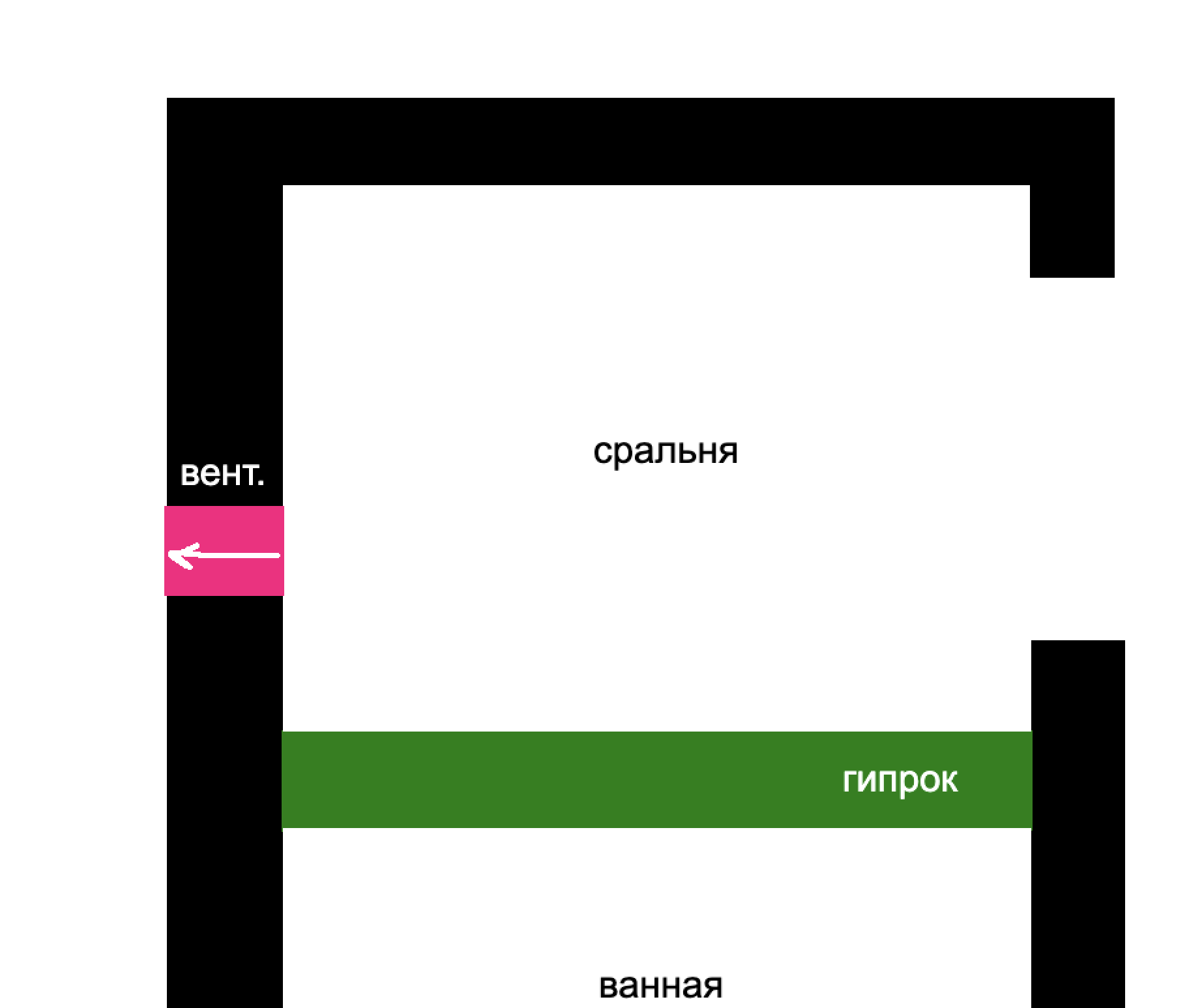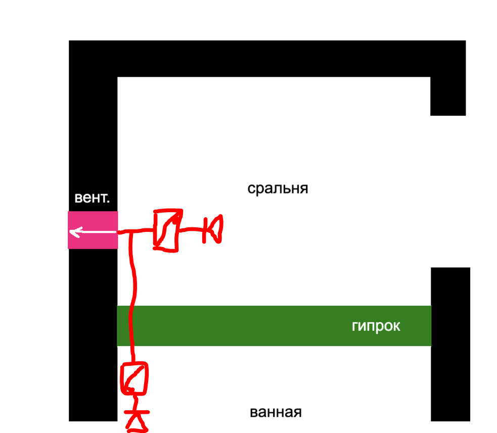 Самое главное: как? Да так: труба оттока воздуха убрана в стену, епт, еще на этапе строительства. Есть смежная стена между 2-х комнат: в одну отверстие, в другую отверстие и общий канал вверх и на крышу.