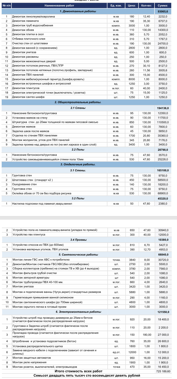 >>372578 >полы по лагам А зачем класть кварц-винил по лагам? Я чего-то не понимаю? Он ведь на бетон кладётся, стяжка есть в 2.2. Расценки на иные работы, включая часть электрики (именно часть, ибо дизайн-проекта ещё нет, только пилится) в прикрепленной картинке >>372504