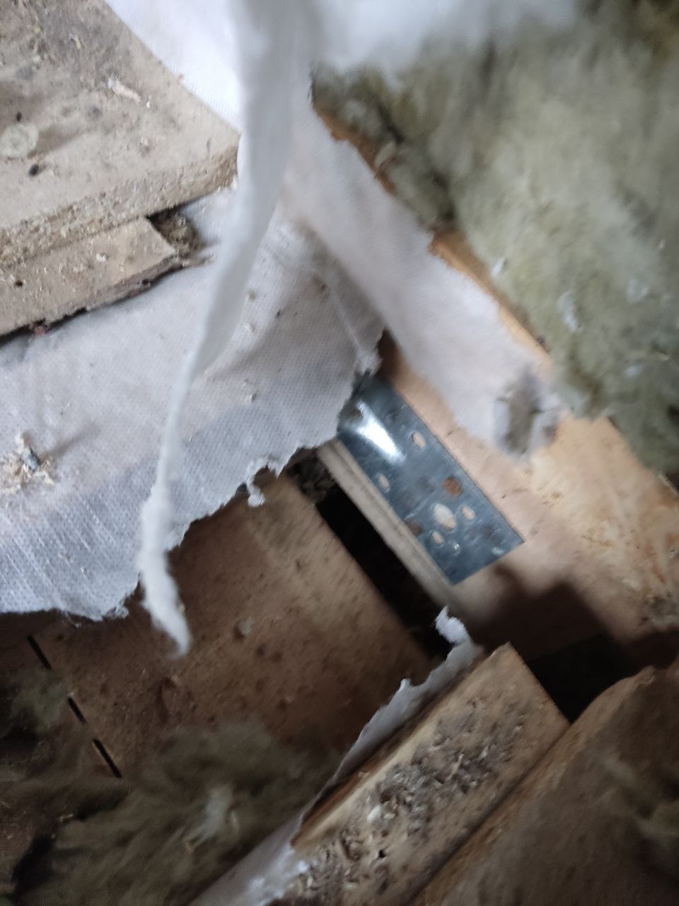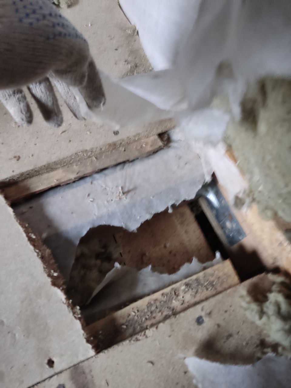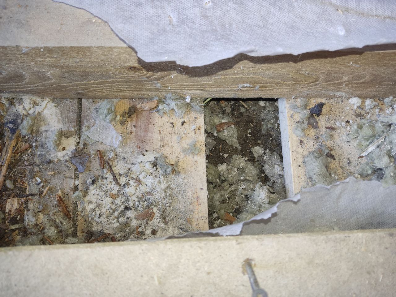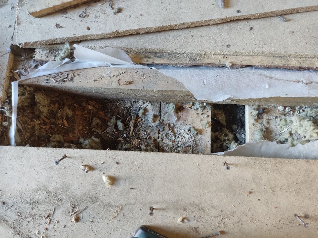 Дошли, наконец, руки до сарая, решил начать с полной инспекции пола и уже после первого полностью снятого листа и вытащенного утеплителя появился сюрприз - видимо, в этом месте доски чернового пола соприкоснулись с землей или, в принципе, хуёво проветривались - и сгнили, буквально на пиках справа доски нормальные, слева - гнилые в труху, ломаются пальцами. Что самое плохое - гниль перешла на балку пола.