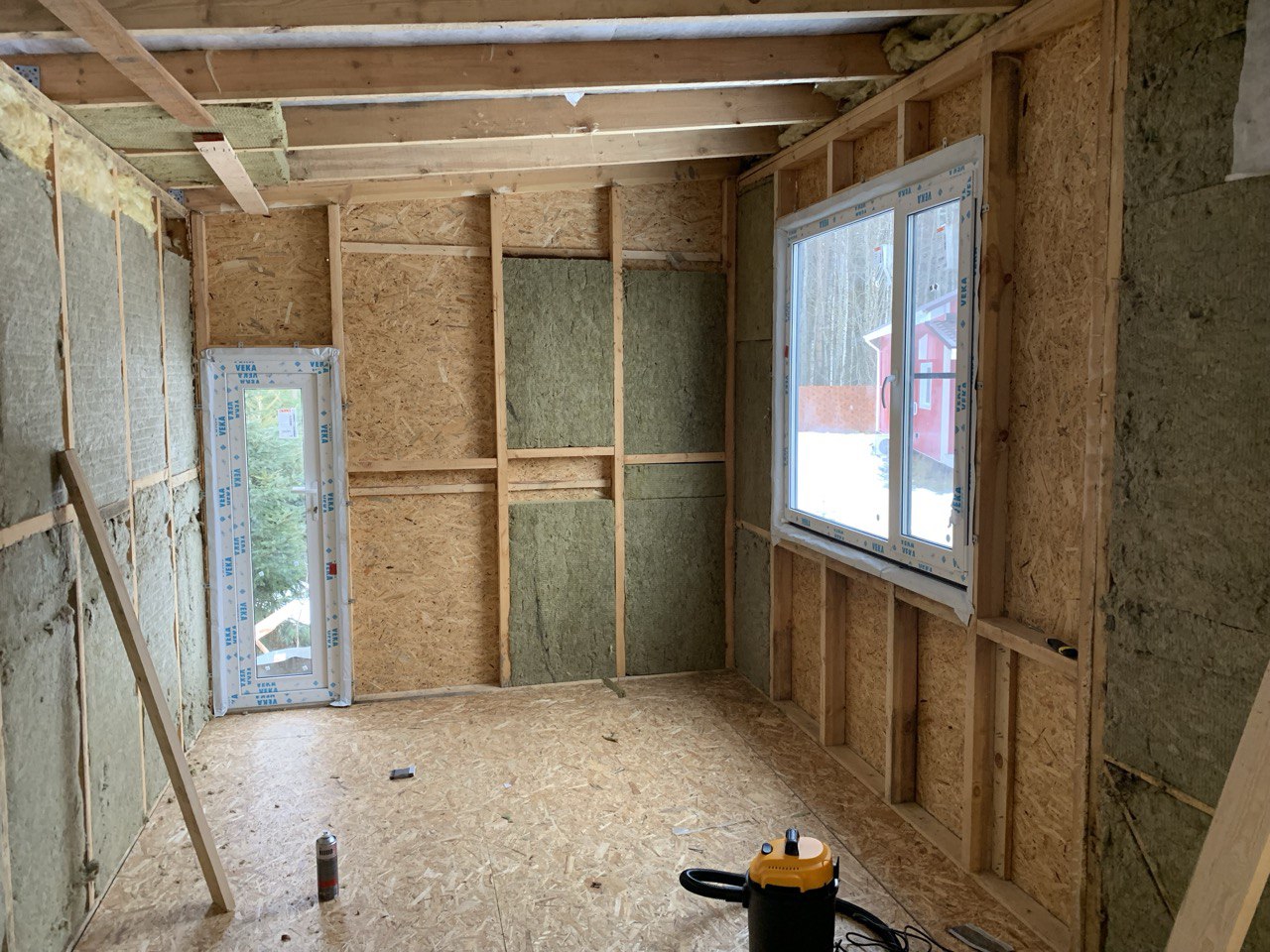 Ну, вообще, она уже была в виде двери из осб - это показалось удобным, когда внутри была перегородка, так что есть мысли поставить внутри перегородку после завершения утепления, чтобы отделить рабочую зону от кладовки, в кладовке можно держать более низкую температуру. Сама дверь по факту немного больше, чем кажется на фото, захожу через нее в зимней одежде без проблем.