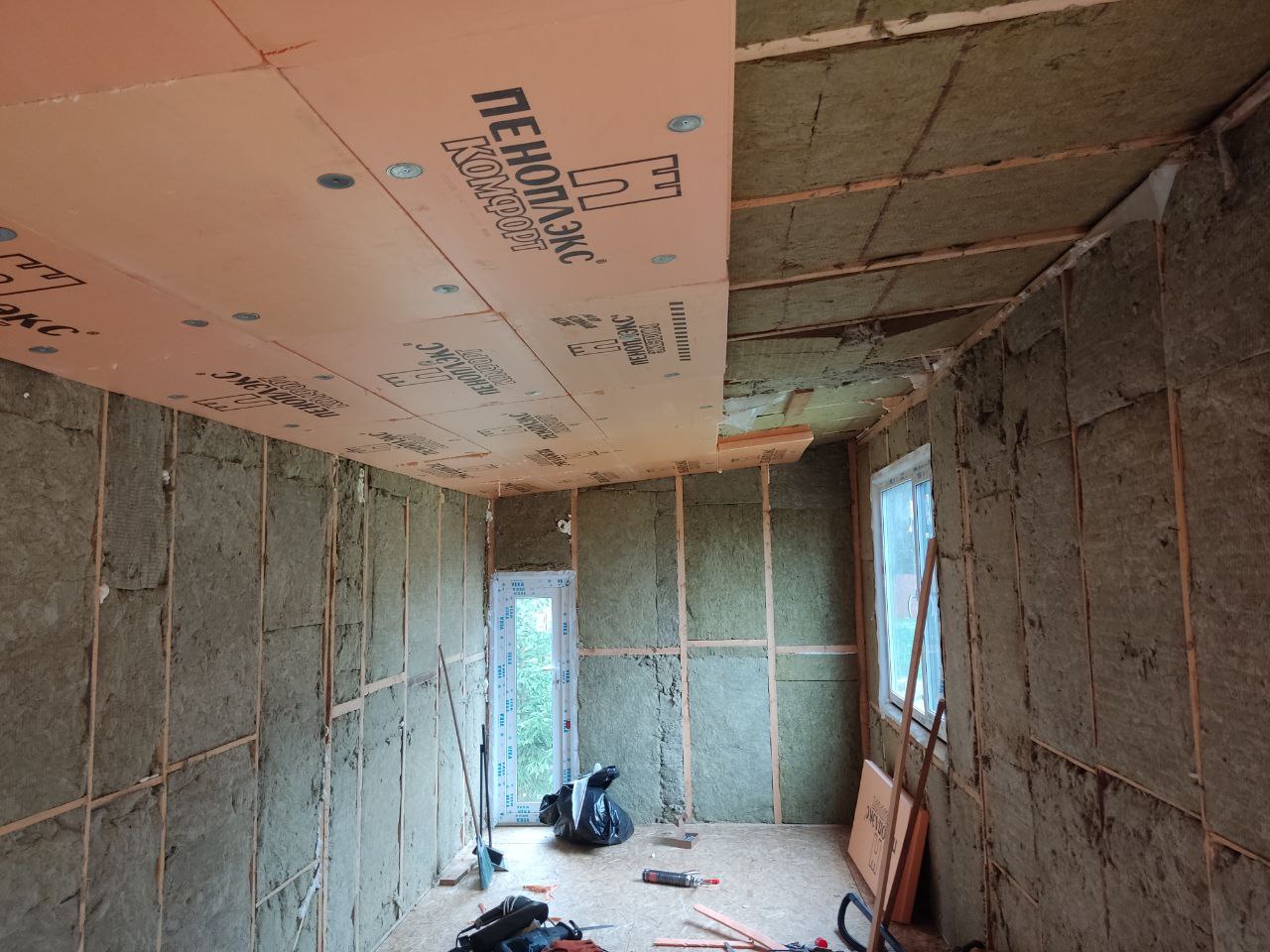 Также на фото видно процесс утепления стен - в части стен под осб была пятёрка минваты, причем, рулонного утеплителя. Постелил черновой пол, на который буду еще укладывать пеноплэкс по технологии утепления пола с их сайта - https://www.penoplex.ru/lib/stati/poly-nad-ventiliruemym-podpolem/
