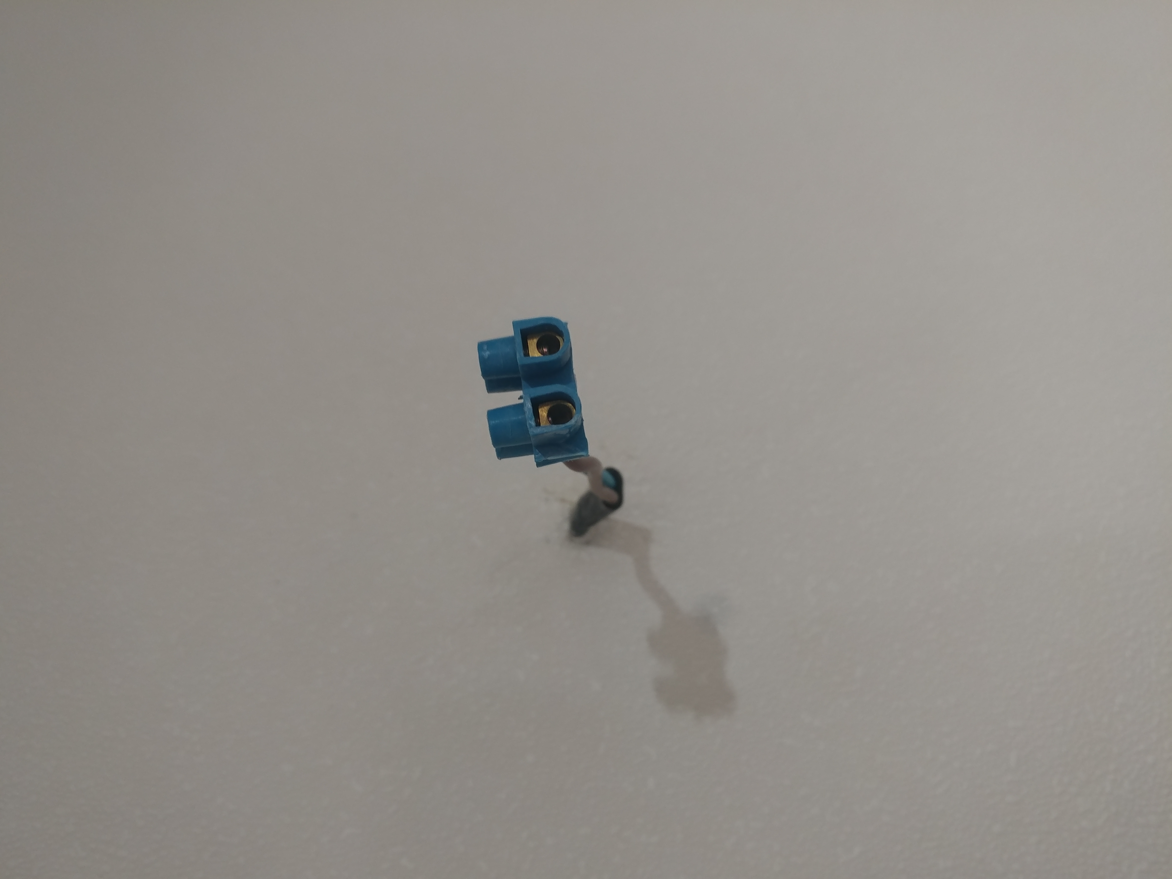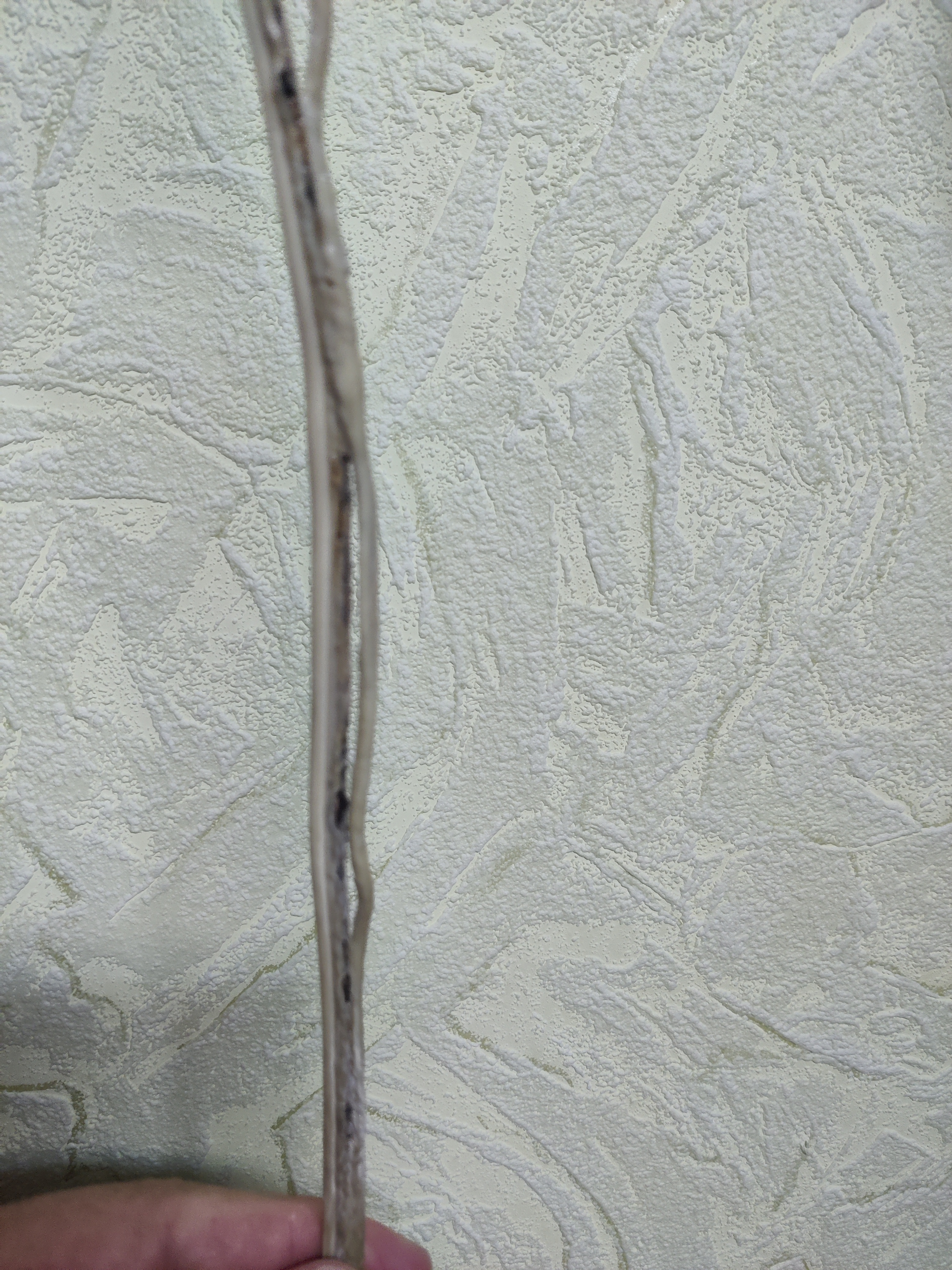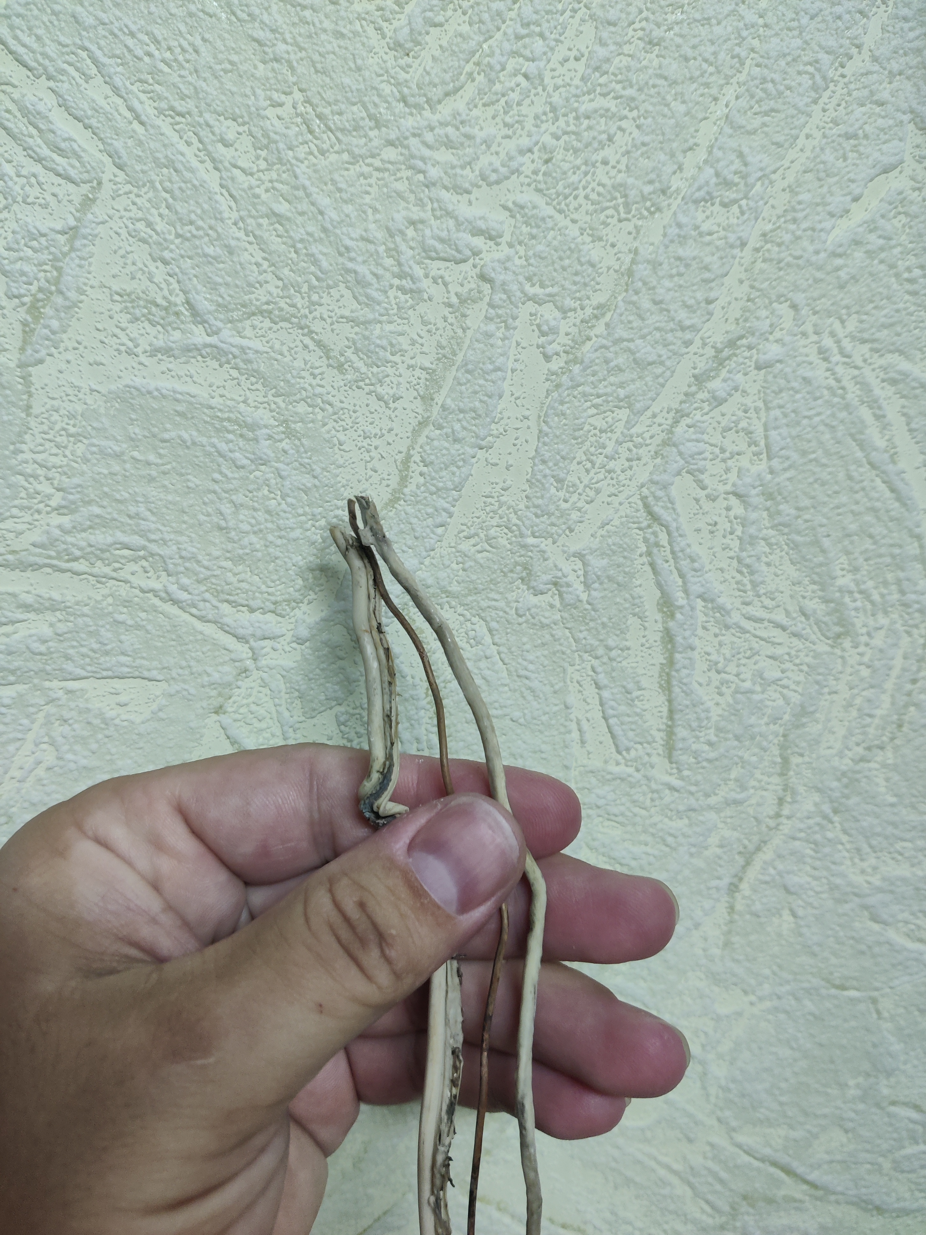 Выдрал из стены останки горелой проводки соседа. Удивительно, но в доме без заземления к нему шёл трёхжильный кабель. И это не две пары с потерянным четвёртым, это именно трёхжильный в общей изоляции. И электрик Жека ЖЭКа тоже говорил, что по проекту на соседскую квартиру разведена одна линия. В общем, средняя жила вышла погулять полностью. И, наверное, так бы оно долго ещё висело, да только отгорело на скрутке разветвления...