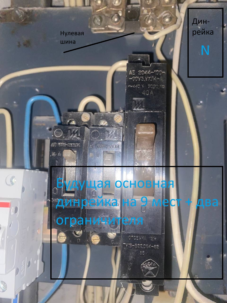 У соседа на вводе уже видно прокинут трехжильный провод как надо, а автомат абб на 40А. Разводить проводку я заново не могу, так что исхожу из существующего. Сверху прямо на щитке, на шине у меня ноль от автоматов и света.