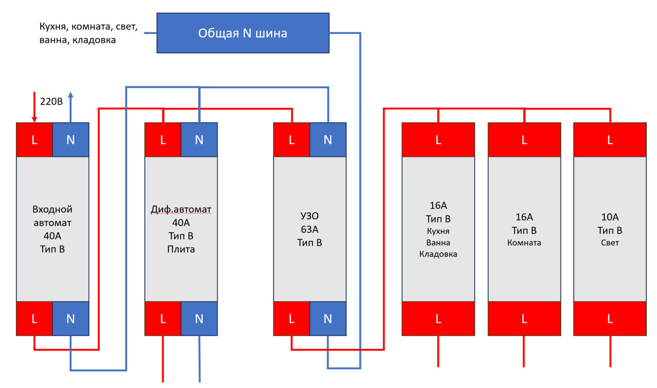 Там я хочу правее установить дин-рейку и на нее нулевую шинку на 4 провода для света, кухни/ванны/коридора/кладовки и комнаты. А ноль от плиты я кину напрямую к диф автомату на 40А. Длины хватает.