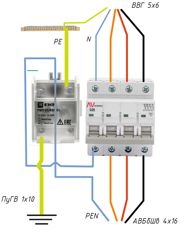 Надо завести новую линию в садовый домик. Щиток со счетчиком за участком, к нему кинут под землей кабель АВБбШв 4х16. Повторное заземление у дома, схема TN-C-S. Все верно же? Или я че-то намудрил с этим проходным блоком.