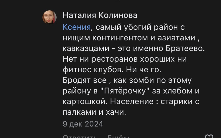 Вы же нищенки. Какие вам квартиры в Москве? Сидите по деревням своим, доите коров, режьте свиней, собирайте урожай. Москва не для вас. Вы не для Москвы.