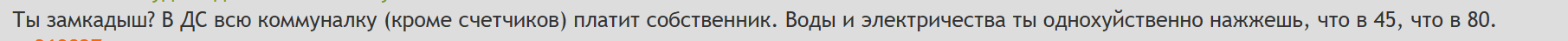 >>369826 >Кому не надо переплачивать за 80м? Любому не дебилу, хлебушек. Во-первых, ценник одинаковый. Переплачиваешь ты за 45 метров, стоимость квадратного метра в месяц у тебя почти вдвое дороже. Во-вторых, Зачем мне по одинаковому прайсу жить в клетушке на 45 метрах, если можно жить в нормальной квартирке в 80 метров? >колько там будет одна только коммуналка? Ты замкадыш? В ДС всю коммуналку (кроме счетчиков) платит собственник. Воды и электричества ты однохуйственно нажжешь, что в 45, что в 80. >>369827 Ты в подъезде жить собрался или что? Лучше то, что не будешь лифта ждать по 30 минут утром как пикодебилы. Качество стройки получше.