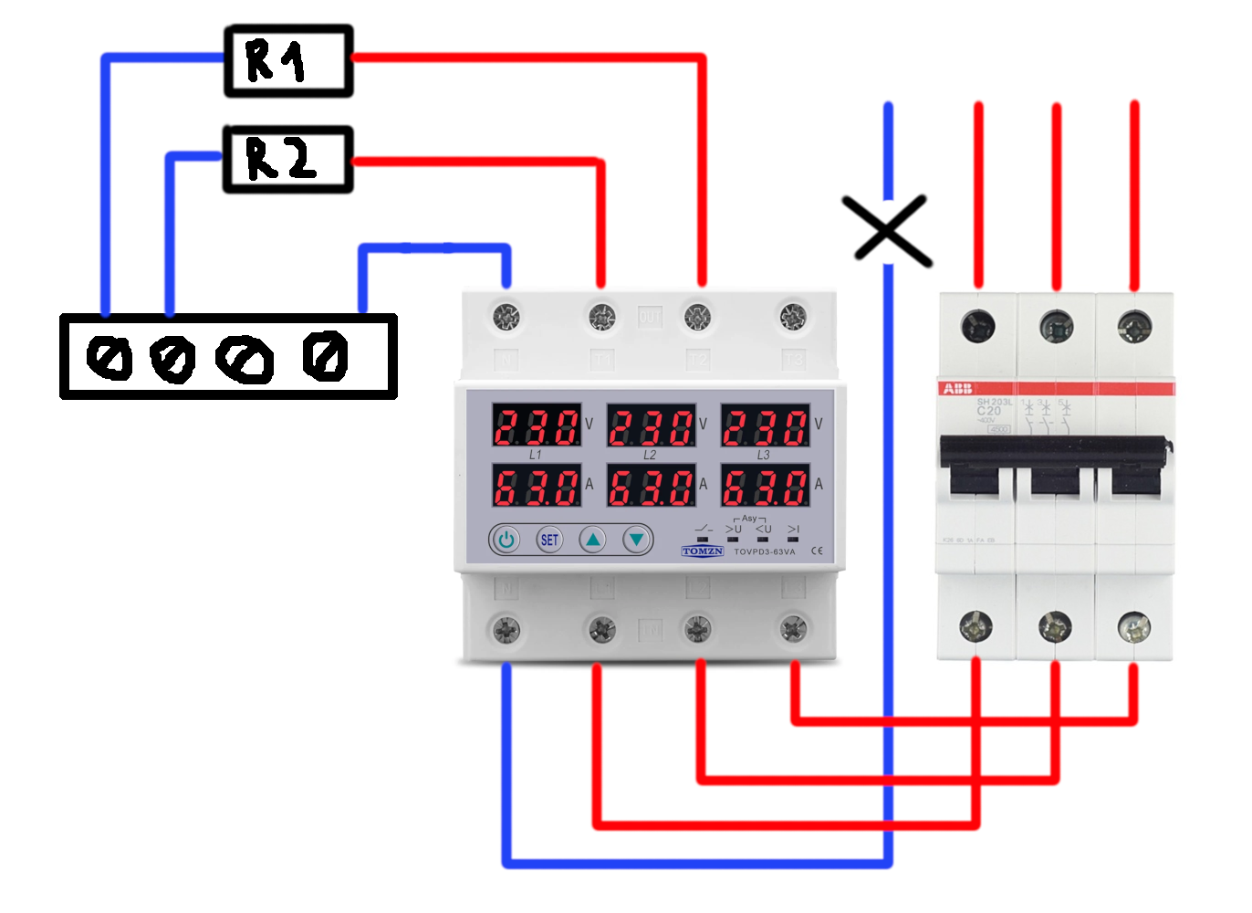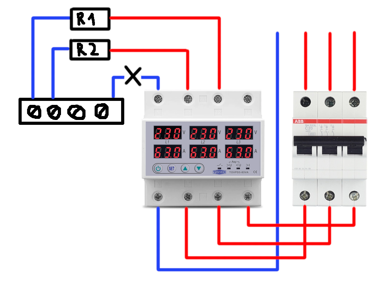 >>379271 Никак. У него ноль нерасцепляемый, там тупо перемычка между контактами. Реле следит за напряжениями на фазах. На схеме после обрыва нуля межфазные 400 вольт поделятся в соответствии с сопротивлениями нагрузок. Если перекос будет опасным, реле должно отключиться.