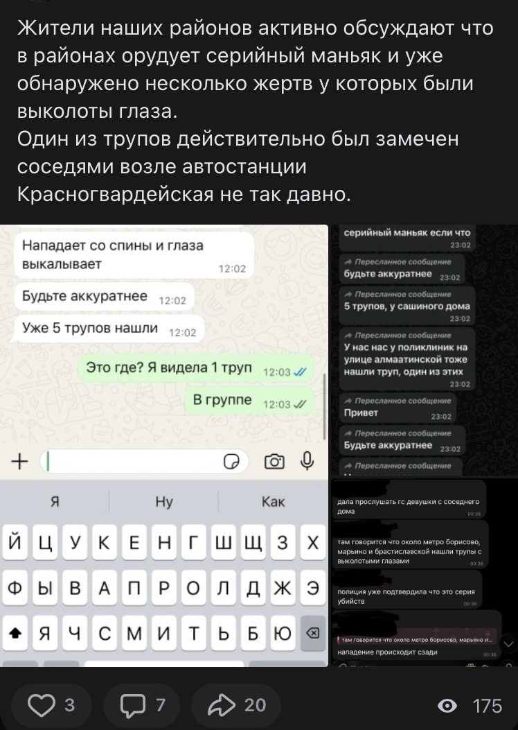 >>376579 Тоже с дуракчка орнул. Маньяк, который выкалывал глаза жертвам, давно был бы во всех таблоидах на первой полосе. О нем бы писали в базах, мэшах, шотах, собчаках и так далее. А тут этот дебил перемогает скриншотиком какого-то постироничного паблика с тремя лойсами и сотней просмотров. .