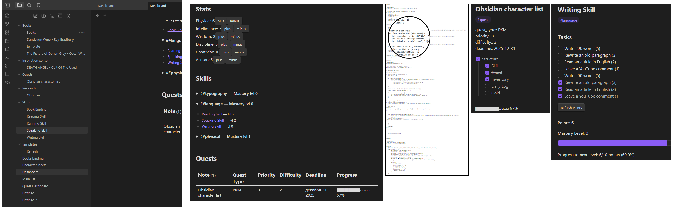 Ну я Обсидианом занимаюсь, очень хочется всё остальное делать, имея такой йоба‑трекер. Собственно, дрочить предполагается на Dashboard, который уже состоит из разных блоков, максимально связанных между собой. Т.е. на Статы влияют Скиллы, на которые влияют Квесты, ну и ещё куча всего (чего пока не добавлено) влияет на кучу всего. Сейчас я пытаюсь составить какую‑то минимальную структуру с минимальной автоматизацией и красивыми циферками.